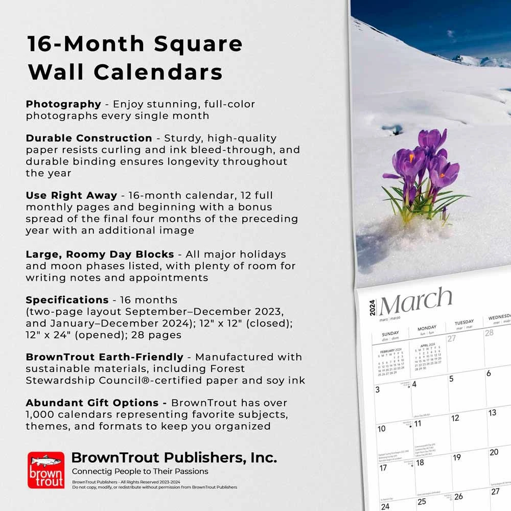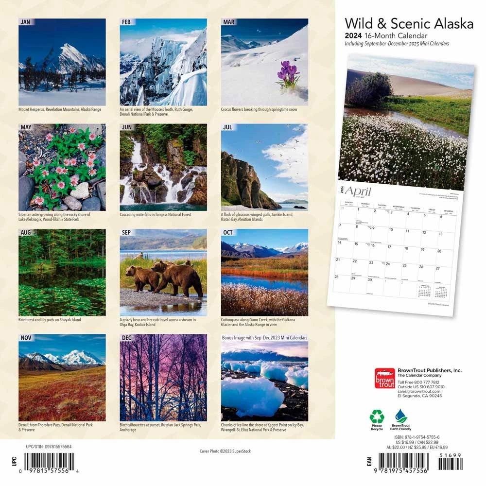 As America’s last wild place, the Alaskan wilderness offers unsurpassed beauty, purity, and serenity. This isolated state features glaciers, fjords, and still unnamed lakes. It boasts wildlife in abundance and enjoys the Aurora Borealis in its colorful dance across the sky. It all makes for a wondrous refuge from the push and shove of modern life. This spectacular calendar delivers the remote wilderness of Alaska to you.