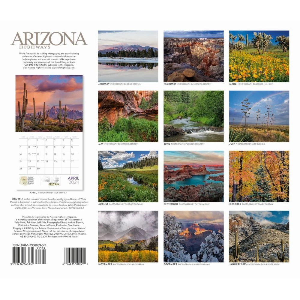 Discover the natural wonderland of the Southwest with exquisite images of Arizona from some of the best photographers in the world! Arizona Highways’ 13 month large scenic wall calendar includes descriptive text, maps and information about each location shown. This 14″ x 12″ calendar features 14 stunning, full color photographs. It offers generous room for notes and date by date reminders and includes previous and next month views.