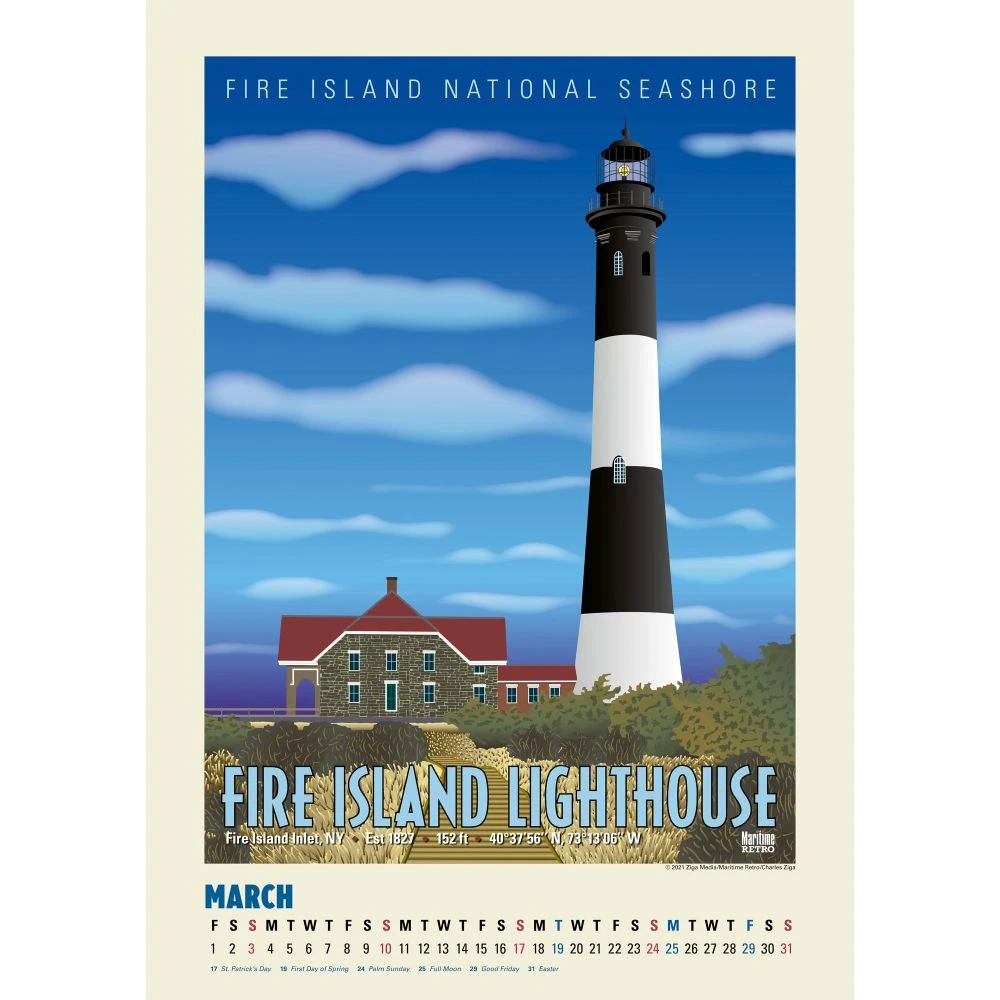 Bold, coloful poster designs with playful typography depicting Atlantic Coast lighthouses, with facts including location, established date, height, latitude and longitude coordinates. Spiral-bound 12-month calendar in oversize vertical format.