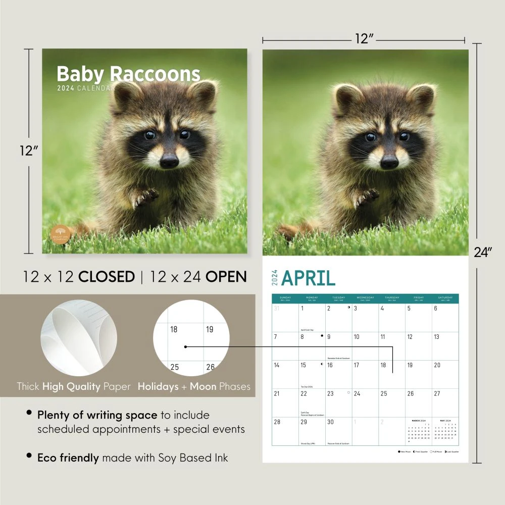 2024 Baby Raccoons Calendar! These cute little creatures may be trouble makers, but they are adorable nonetheless! Raccoons are nocturnal animals who sleep during the day and are awake during the night. Male raccoons are called a “boar” and a female raccoon is called a “sow”. Baby raccoons, featured in this calendar, are called “kits”. Enjoy our cute 2024 wild animal wall calendar. HIGH QUALITY: 2024 Zoo Animal Calendar Size Closed: 12 x 12 Inch. Opened: 12 x 24 Inch. Does not bleed through! 13 Full Color Images in our 2024 Wildlife Calendar! All 2024 Cute Calendar photos are hand selected from a wide array of photographers from around the world! No compromises are made on image quality or content in our 2024 raccoon wall calendar.