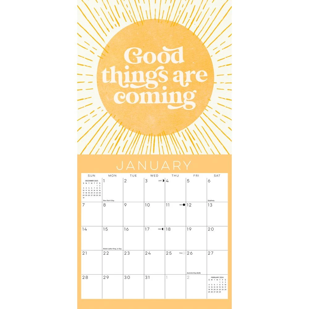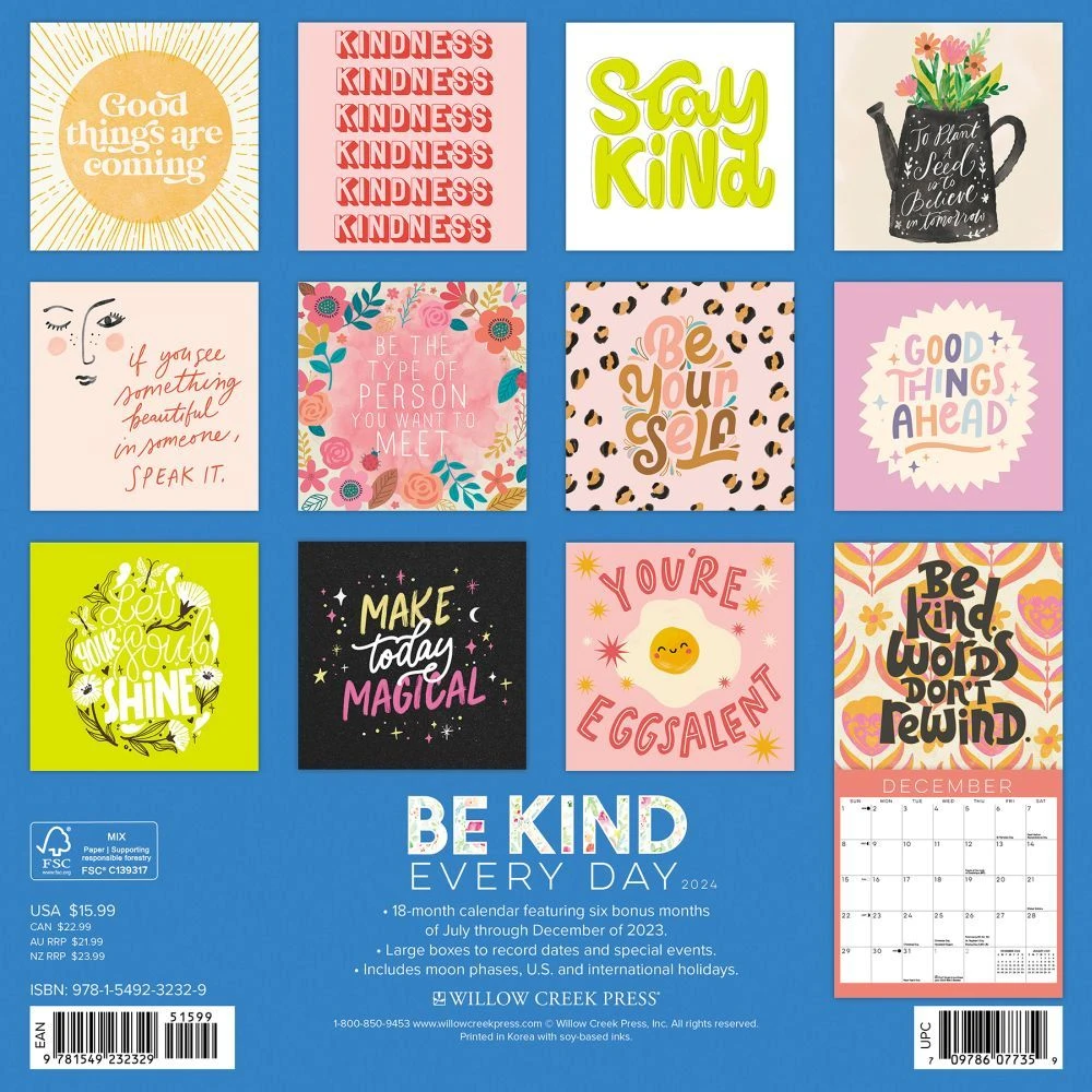 Our ability to reach out with random acts of kindness is a powerful thing. The benefits ripple out to create a community that actively seeks small moments of joy. This calendar encourages us to make space for these encounters and be gentle with ourselves as we strive to be gracious to others. Printed with soy based inks on FSC certified paper, this 12 x 24 wall calendar features large monthly grids that offer ample room for jotting notes, along with six bonus months of July through December of 2023. Also includes moon phases (CST), standard U.S., and international holidays, in addition to kindness themed holidays sprinkled throughout the year.