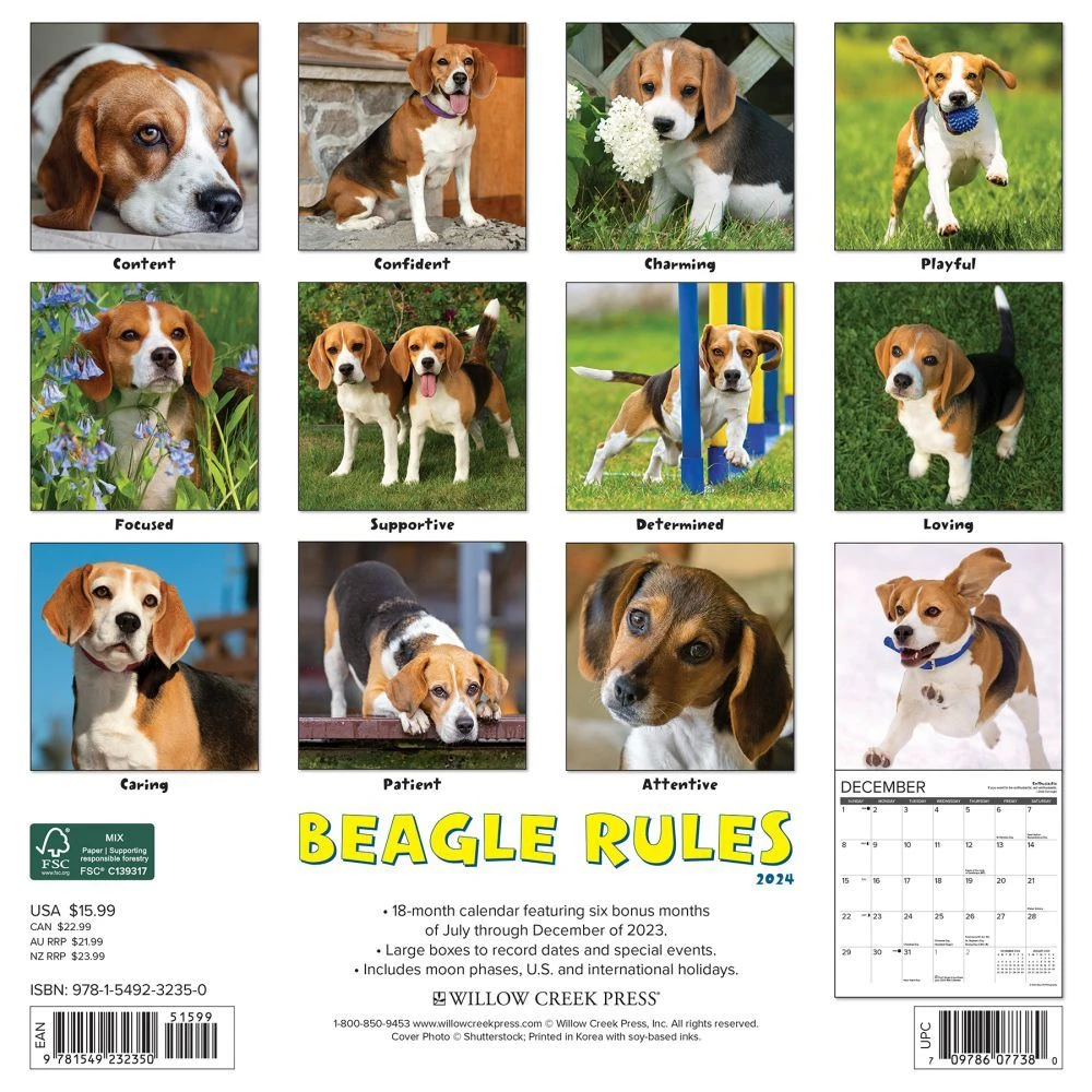 Beagles exhibit some of the highest virtues to which we mere humans can aspire.? Twelve cheerful color photographs, each paired with accompanying text, display special life?s lessons we can learn from these delightful dogs!? Printed with soy based inks on FSC certified paper, this 12″ x 12″ wall calendar features large monthly grids that offer ample room for jotting notes, along with six bonus months of July through December of 2023. Also includes moon phases (CST), standard U.S. and international holidays.