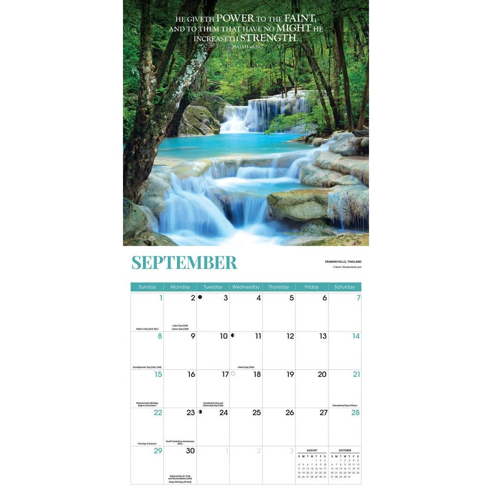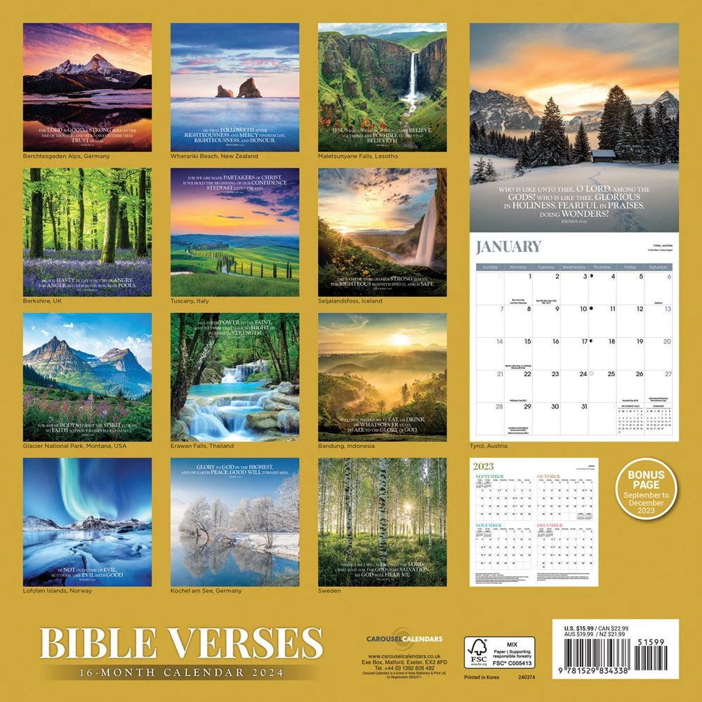 The Bible Verses wall calendar for 2024 will soothe the spirit with a message of insight, faith and wisdom. Each month offers an image of stunning scenery from around the world, a bible verse and a spacious date grid for your commitments. This calendar is free of plastic packaging.