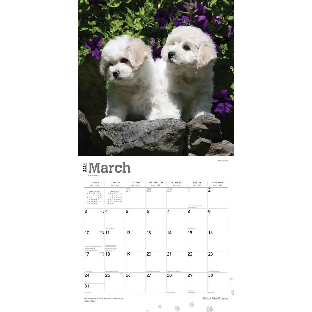 Bichon Frise are gentle mannered, sensitive, very playful dogs. Unleash the year with this cute calendar featuring these adorable pups with little black eyes and cottony fur.