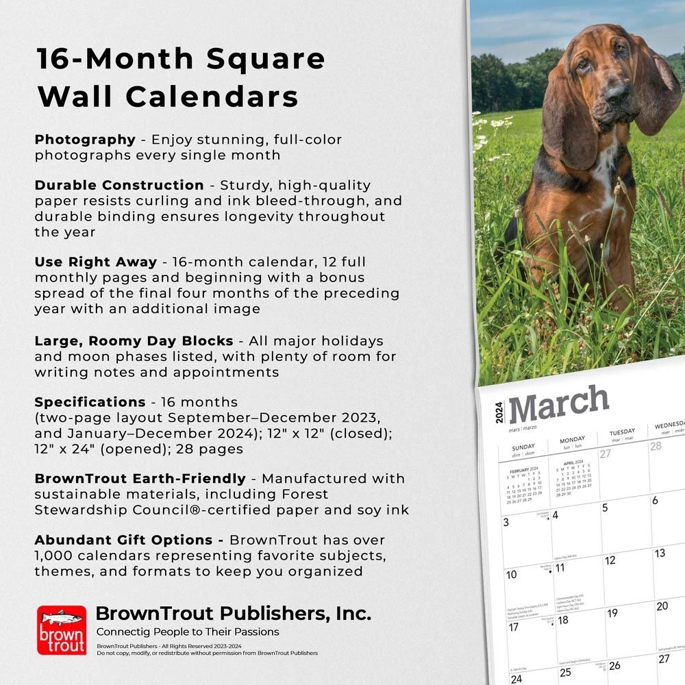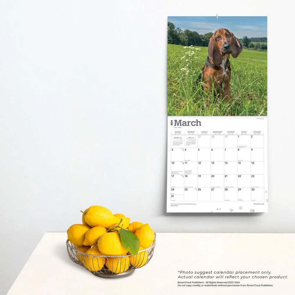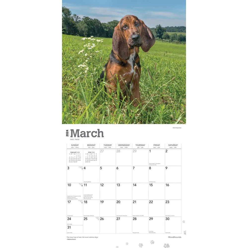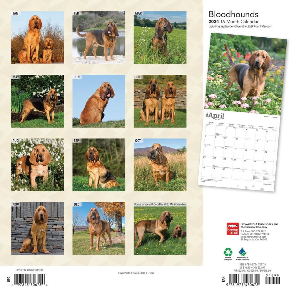 A Franco Belgian breed, the Bloodhound is sometimes called the Chien de St. Hubert. Bred as hunters, Bloodhounds are intelligent and strong, and have a keen sense of smell to go along with their booming voice. They have been esteemed partners of law enforcement officers for close to 200 years. Gentle and affectionate, they love children. Images of these happy, sleuthing hounds fill this delightful calendar.