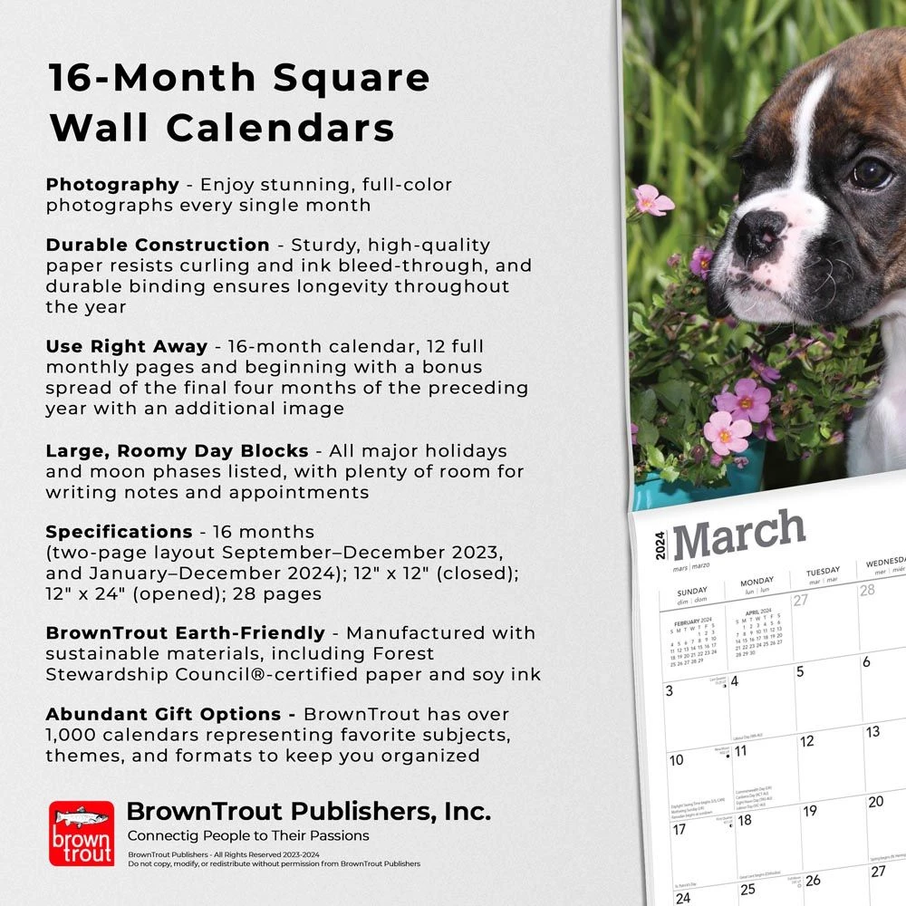 Spirited yet even tempered, a Boxer makes a wonderful pet. Boxer puppies are darling, intelligent, athletic, and social all the admirable qualities of an adult Boxer dog in miniature form. The bouncy Boxer puppies in this calendar will grow up to be courageous and intelligent dogs.