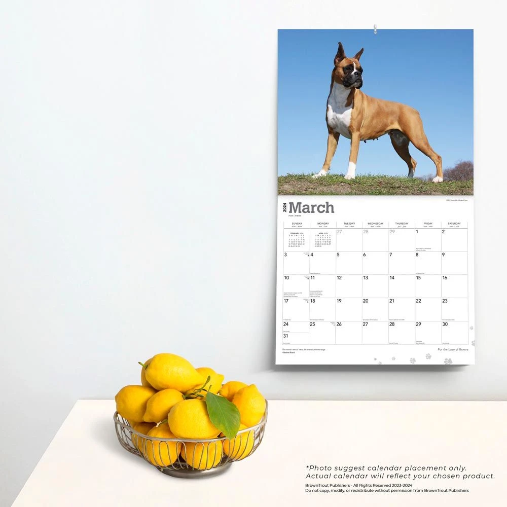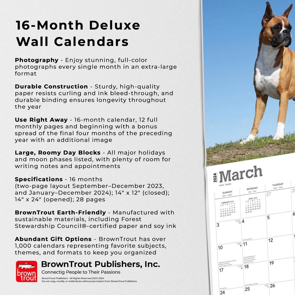 German in origin, the Boxer got its name from its tendency to punch with its paws when it’s in a tussle. Strong, sturdy, and intelligent, the Boxer has an impressive resume as a working dog: herder, hunter, circus trickster, military guard, police dog, and the list goes on. This dog loves to jump and can play for hours. This calendar will delight any lover of this fabulous breed.