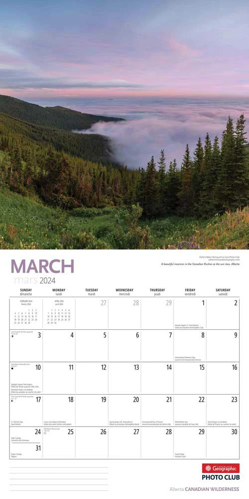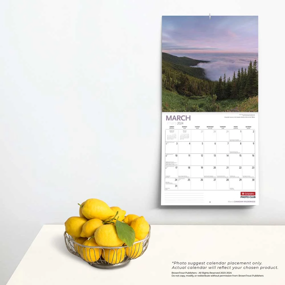 From north to south and east to west, this collection of images, taken by members of the Can Geo Photo Club (photoclub.cangeo.ca), captures the diversity and splendour of the wilderness of Canada. This square wall calendar is produced in English.