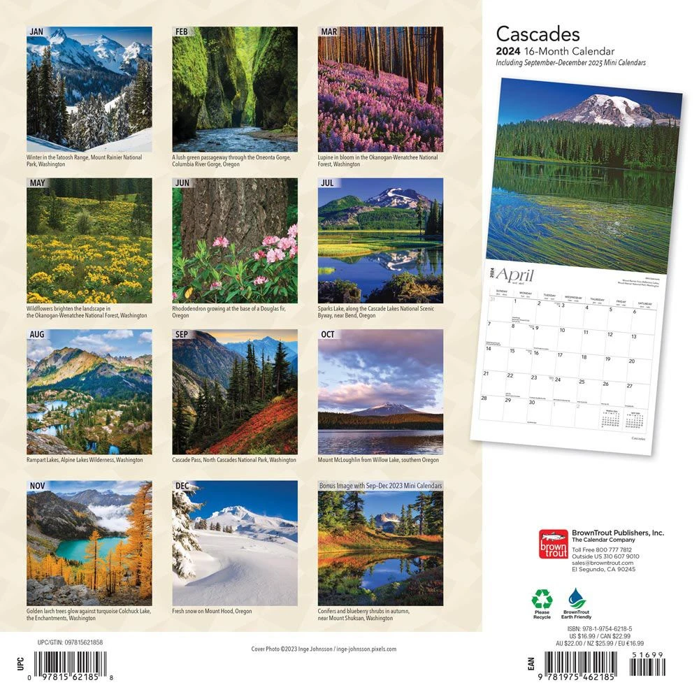 This striking mountain range may seem larger than life, but this calendar offers it in a size more easily enjoyed. Lining the West Coast with its many peaks and valleys, the Cascades are a marvel to behold, especially at different times of day and during different seasons. Every month within this breathtaking calendar offers something unique!