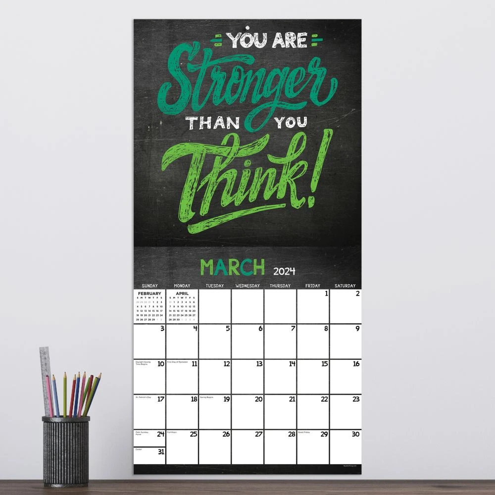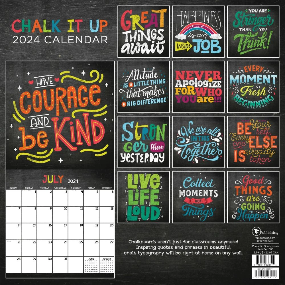 Chalkboards aren’t just for classrooms anymore! Inspiring quotes and phrases in beautiful chalk typography will be right at home on any wall minus the sound of nails on a chalkboard! This 2024 12 month wall calendar measures 12″ x 12″ and includes thirteen color popping, chalk style designs combined with monthly calendar grids and a bonus 4 month view of January 2025 April 2025. Printed on premium matte paper that works great with either a pen or pencil.