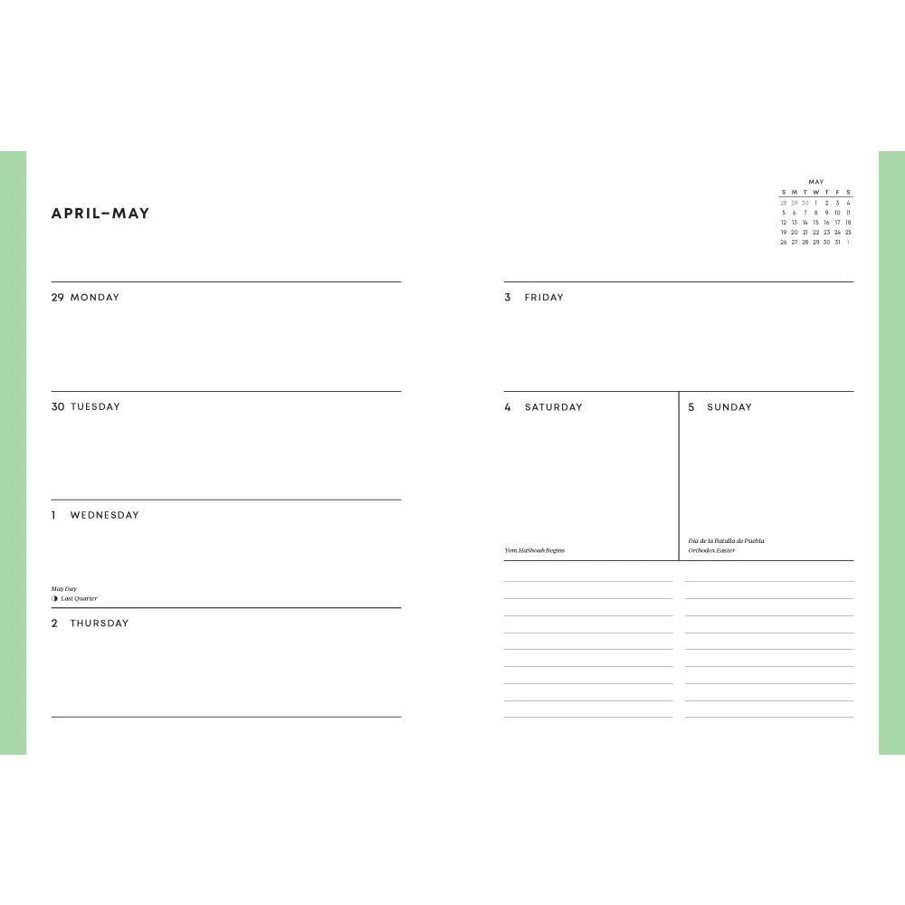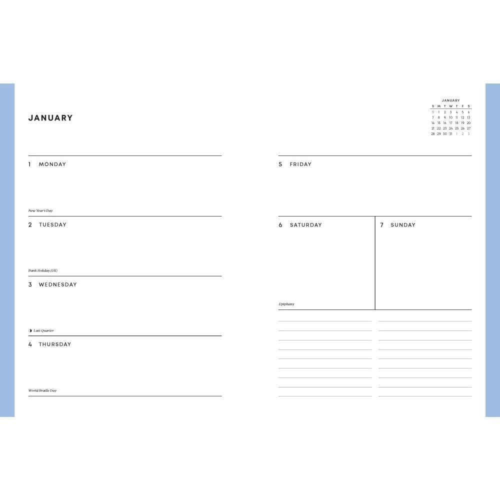 Measuring 6 x 8 inches and containing 176 pages, this durable hardcover planner is designed to accompany you through every day of the year. It includes year-at-a-glance, month-at-a-glance, and week-at-a-glance pages, as well as holidays and important dates, providing plenty of space for notes and daily adventures. A handy ribbon marker helps you keep your place easily.
