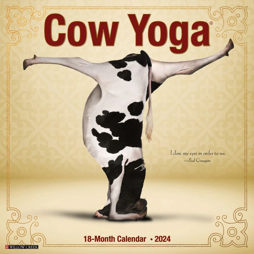 Fascination with yoga is sweeping pastures throughout the world. Cows are turning to this ancient discipline in herds to reap the benefits of relaxation, flexibility and increased milk production. Twelve classic cow poses, including Downward Facing Bovine (Udder Mooca Svavasana), are aptly demonstrated in this unique calendar. Printed with soy based inks on FSC certified paper, this 12″ x 24″ wall calendar features large monthly grids that offer ample room for jotting notes, along with six bonus months of July through December of 2023. Also includes moon phases (CST), standard U.S. and international holidays.