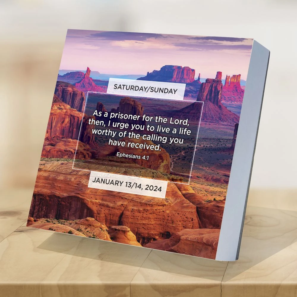 Begin each and every day with peaceful reflection and contemplation of a Bible passage combined with a breathtaking nature photograph. This 2024 daily desk calendar is 5.25″ x 5.25″ and comes with a foldout easel to sit on your desk. The daily pages (weekends combined) easily tear off and feature a Bible verse and photograph paired together on the front and the reverse side is lined for notes. Calendar comes packaged in a wraparound cover.
