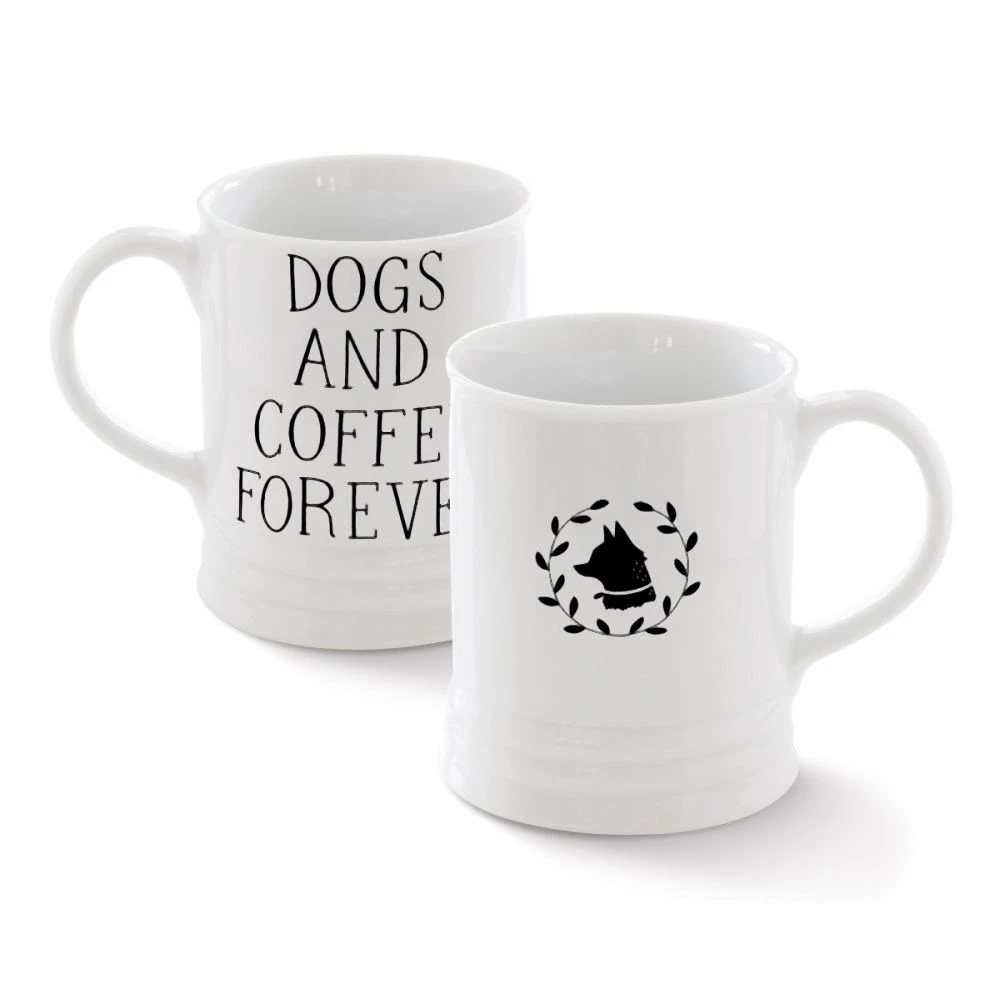 This premium quality classic mug boasts a timeless design that serves up plenty of caffeine and style. On one side youll find witty text Dogs and Coffee Forever and on the other, an eye catching black cat drawing. Each durable mug has a generous capacity of 12 ounces, meaning it will hold plenty of fuel for your day ahead! And after being heated or cooled safety, being cleaned in the dishwasher is no problem either.