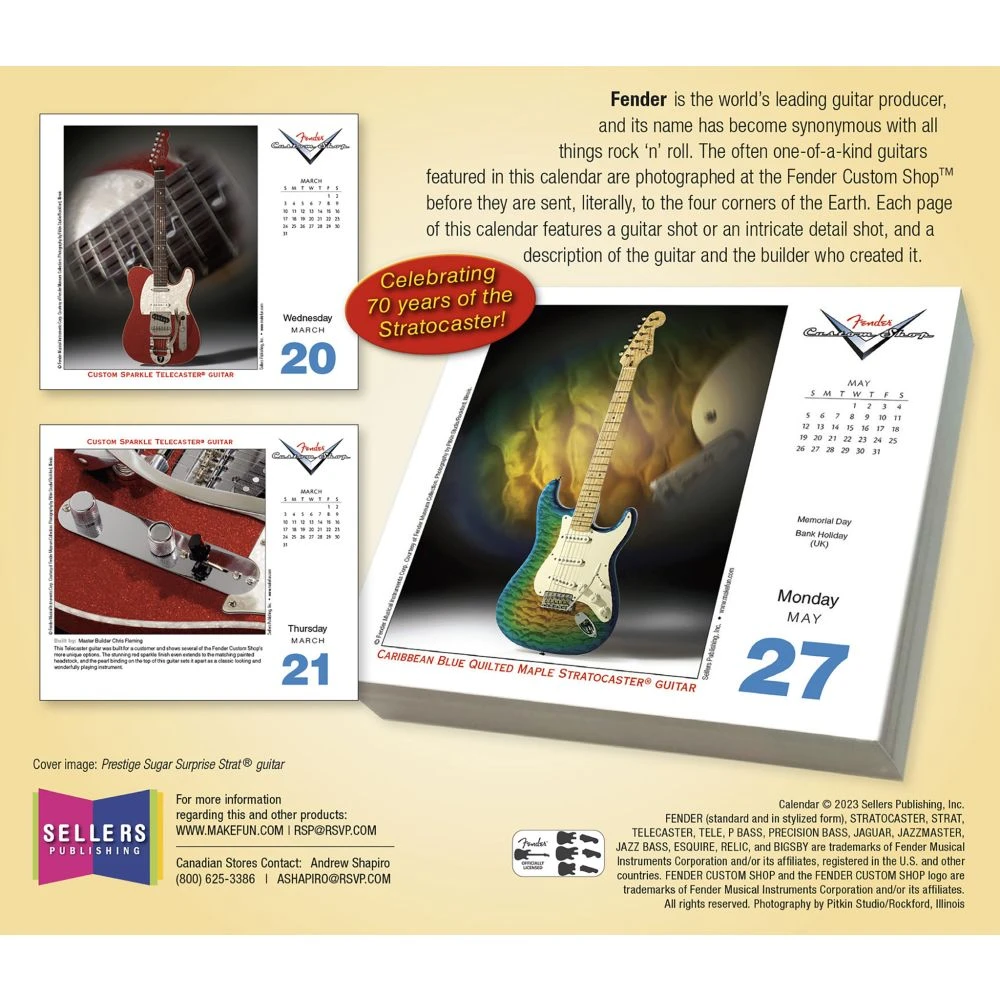 Fender is the world’s leading guitar producer, and its name has become synonymous with all things rock n roll. The often one of a kind guitars featured in this daily calendar are photographed at the Fender Custom Shop before they are sent, literally, to the four corners of the Earth. Each page of this calendar features a guitar shot or an intricate detail shot, and a description of the guitar and the builder who created it.