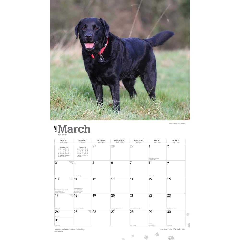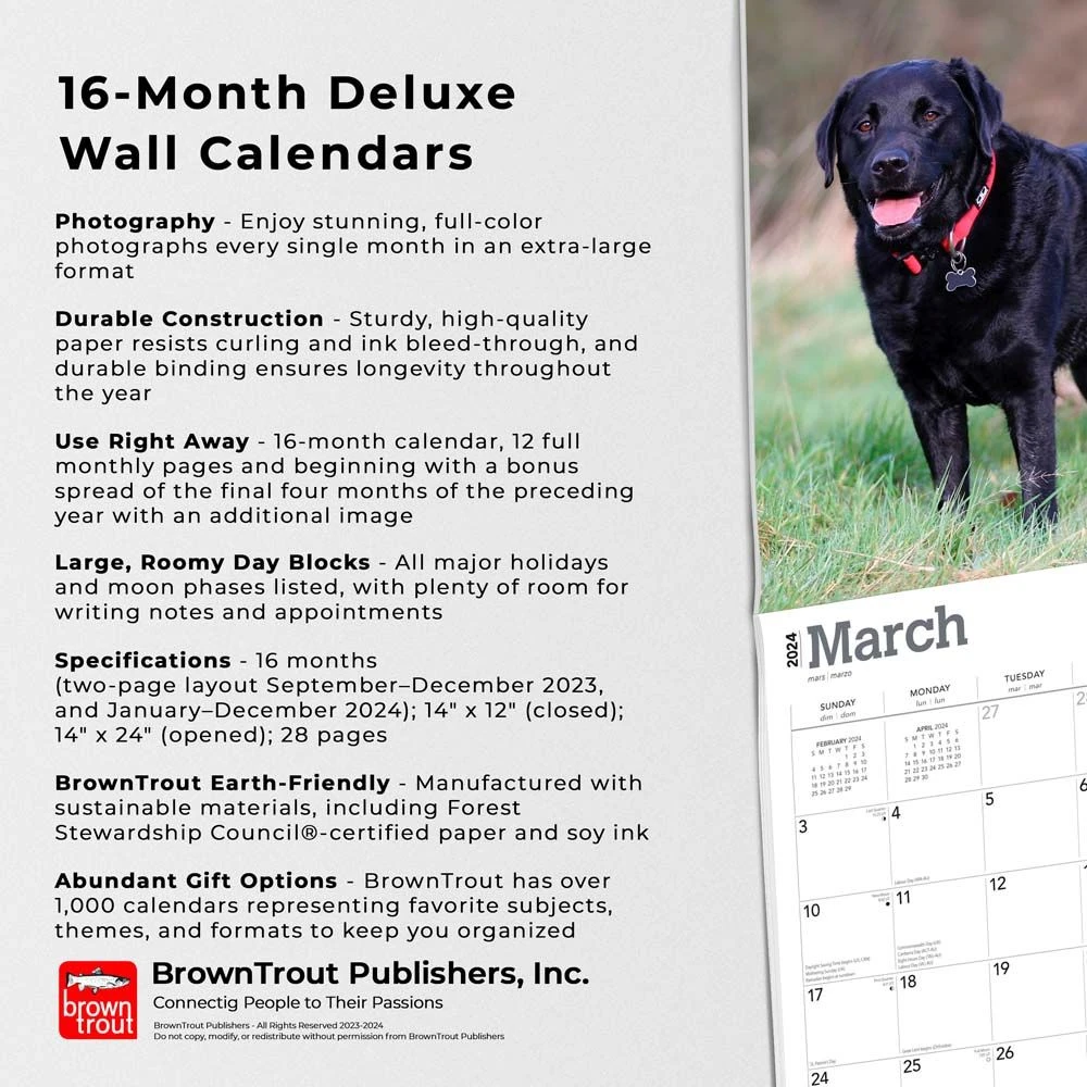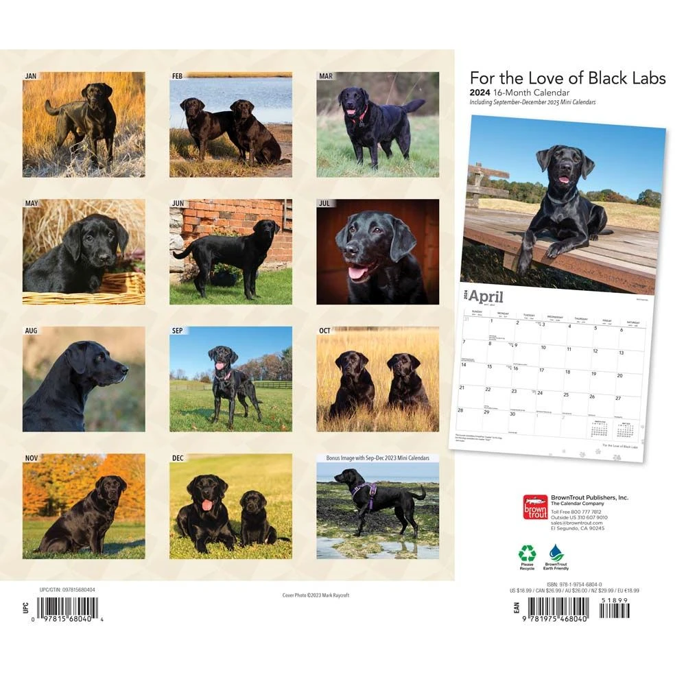 The Labrador Retriever is very eager to please. A loving pet, the Black Lab is a trustworthy, devoted companion. Playful, gentle, intelligent, and alert, they are perfect for families with children and can be trained to perform a variety of helpful services. If they’re not working in some capacity, though, these energetic dogs need lots of exercise. This delightful calendar honors the beautiful Black Labrador Retriever.