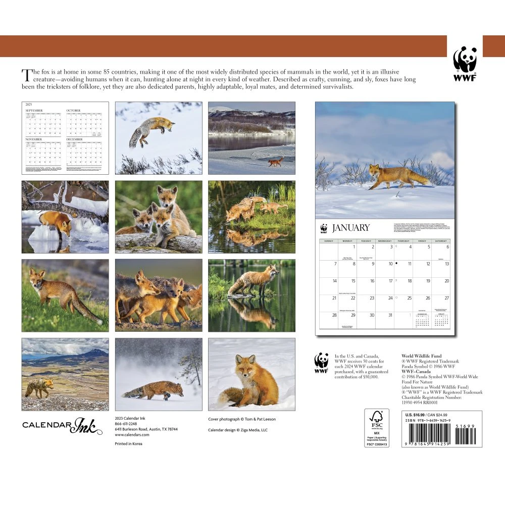 Did you know that a fox uses its bushy tail as a warm cover in cold weather and as a signal flag to communicate with other foxes? Also, a fox’s tail provides balance for this agile creature! The Foxes 2024 WWF Wall Calendar offers a monthly spread filled with vibrant images accompanied by a large grid with moon phases and international holidays. This calendar is printed with soya based inks on FSC certified paper.