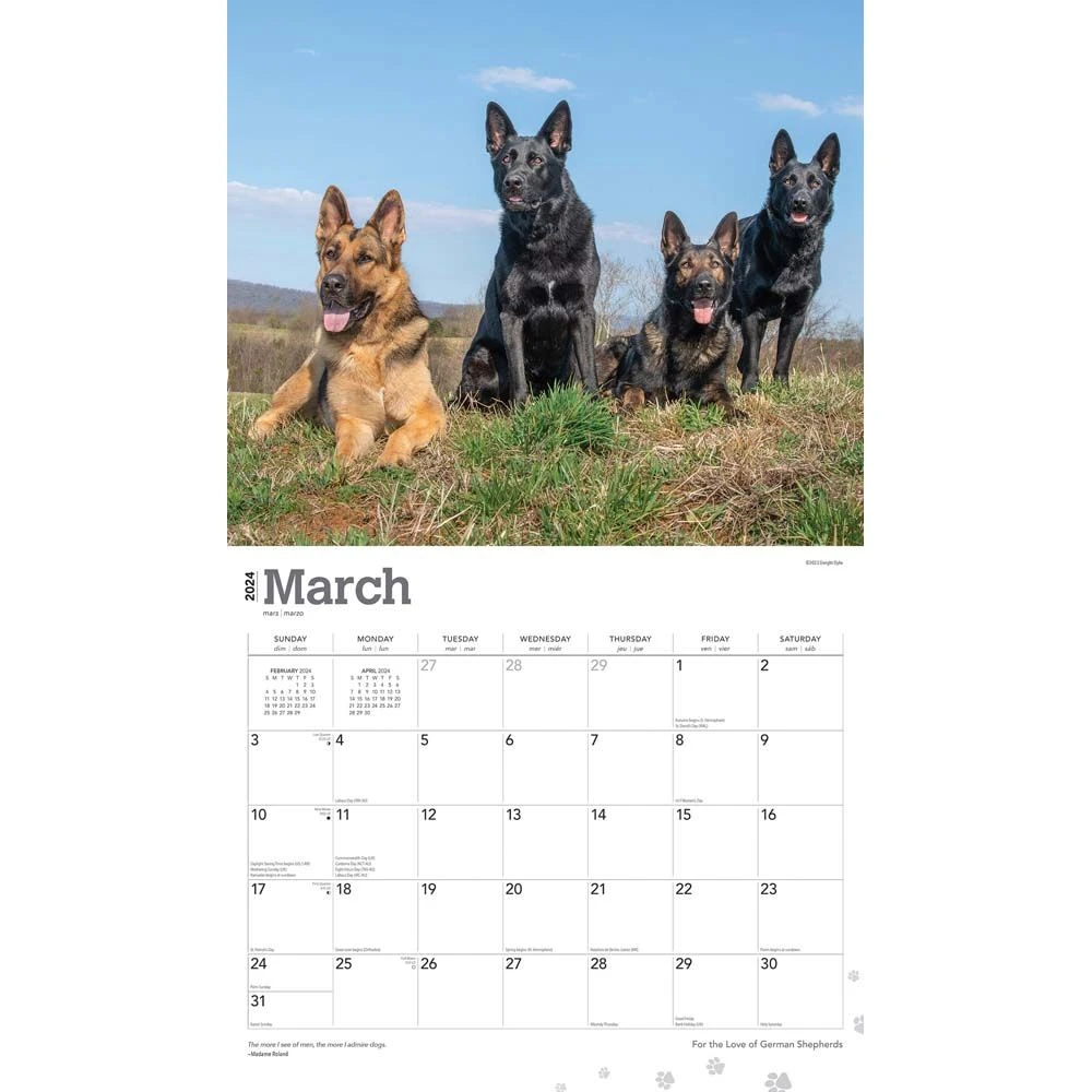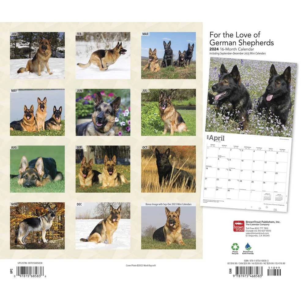 The German Shepherd has earned a reputation as a loyal family companion, guide dog, police dog, and herder. This versatile dog is devoted, courageous, and exceptionally intelligent. Though they are not known for making quick and easy friendships, these faithful dogs will stand by those they love for a lifetime. This calendar honors the noble and courageous German Shepherd.