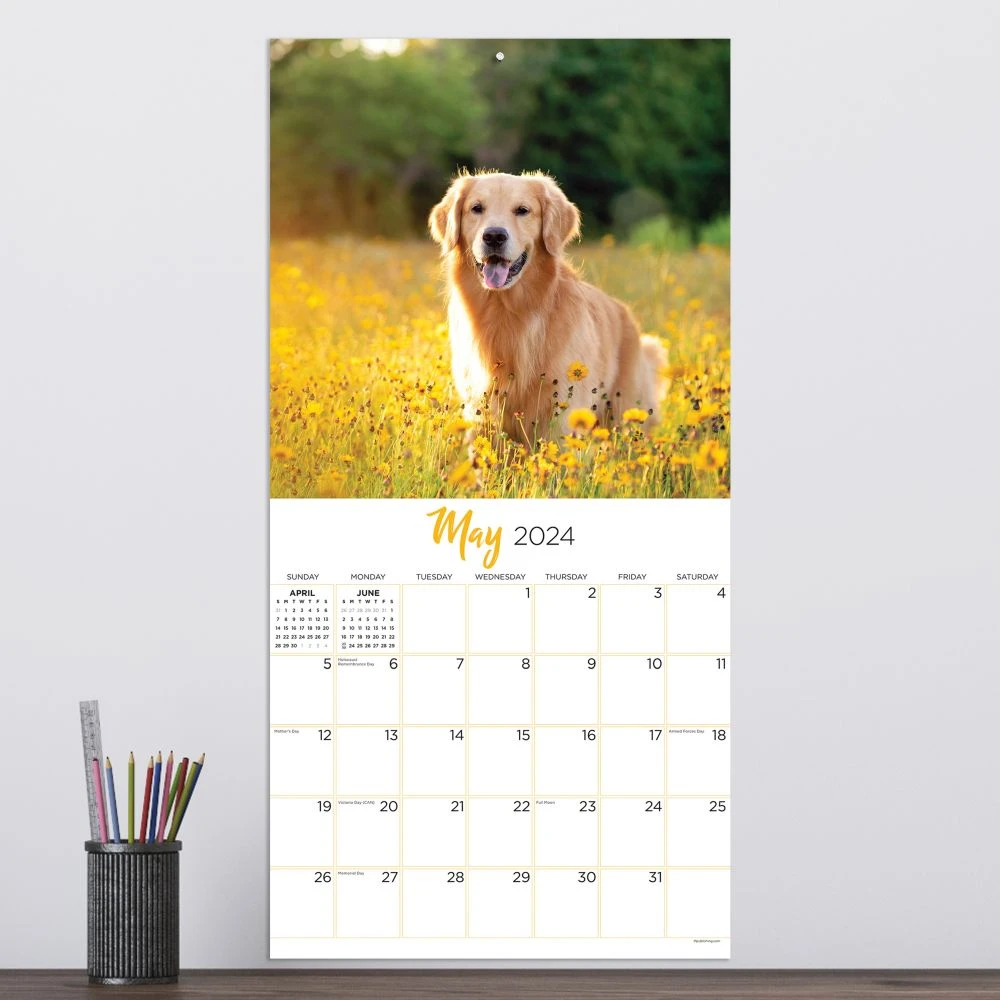 Noble, loyal companions golden retrievers are revered as some of the most joyful and dependable dogs. Loved for their smiling faces, beautiful coats and playful sense of humor everyone needs a golden in their life. This 2024 12 month wall calendar measures 12″ x 12″ and includes thirteen full color images combined with monthly calendar grids and a bonus 4 month view of January 2025 April 2025. Printed on premium gloss paper.