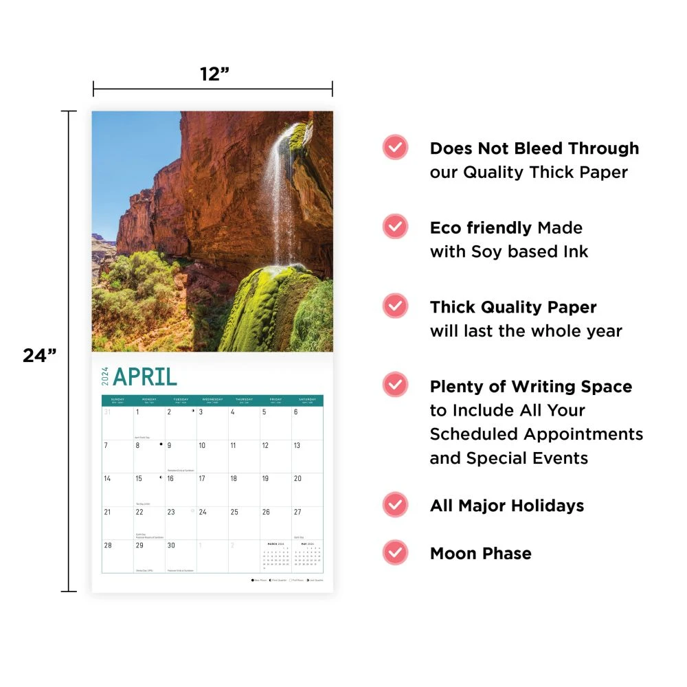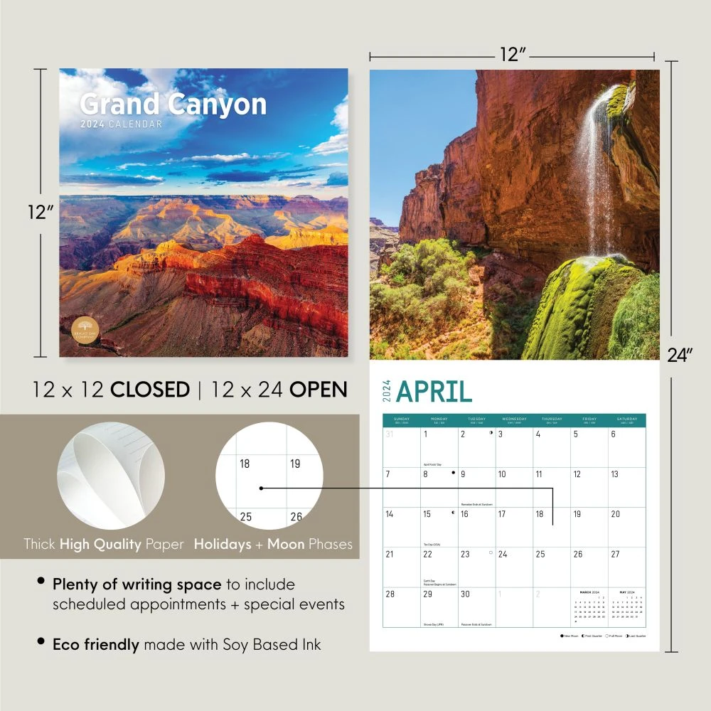 2024 Grand Canyon Calendar! The Grand Canyon is 18 miles wide and 277 miles long. At its deepest, it reaches a depth of over a mile! Geologists estimate that it took 6 million years for the Colorado River to carve this behemoth into the land that is now Arizona. Take one look at these stunning images, and you will be left with no doubt that its size is matched by its beauty. Enjoy this beautiful destination wall calendar. HIGH QUALITY: 2024 Great Outdoors Calendar Size Closed: 12 x 12 Inch. Opened: 12 x 24 Inch. Does not bleed through! 13 Full Color Images in the 2024 National Parks calendar! All 2024 Scenic Travel Calendar photos are hand selected from a wide array of photographers featuring mountains, lakes, trees and nature a true hikers calendar. No compromises are made on image quality or content in our 2024 nature calendar.