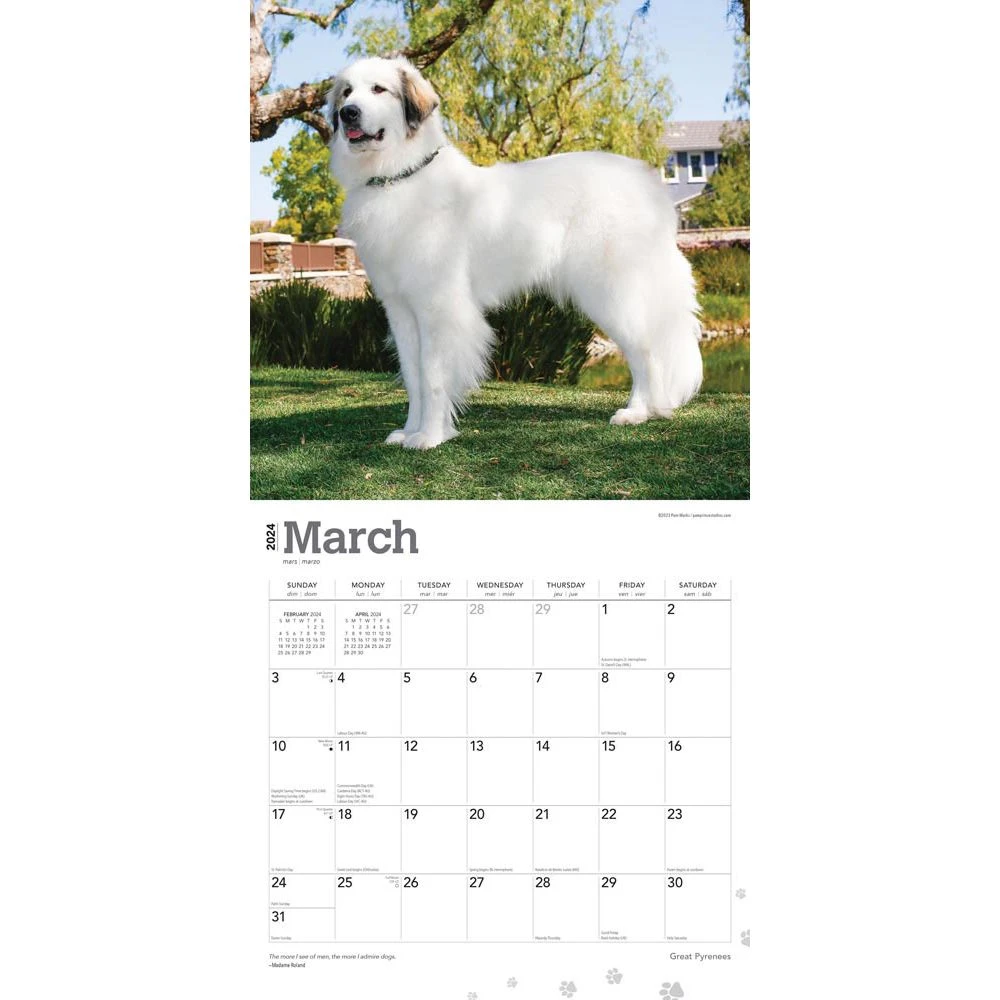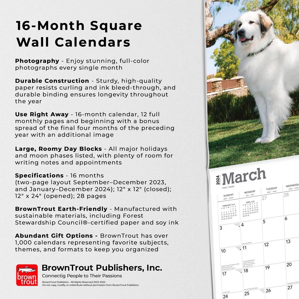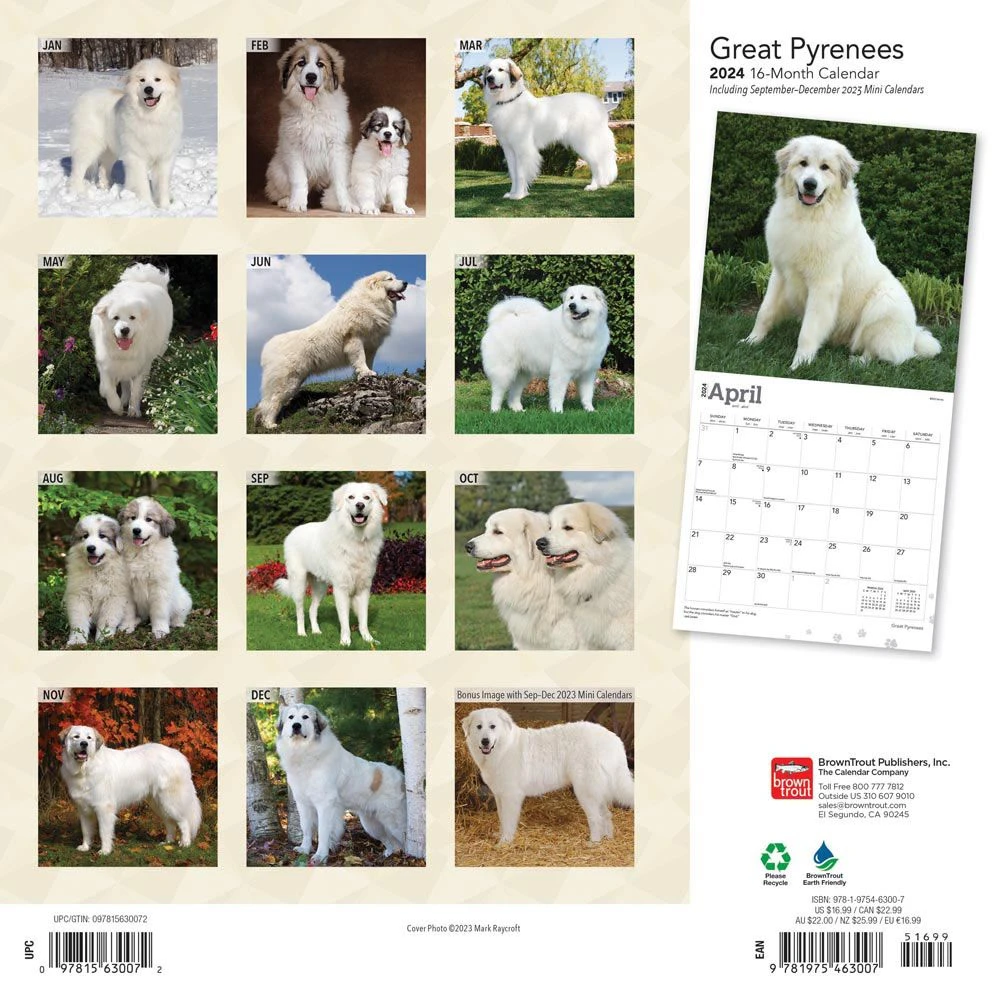 The Great Pyrenees is a graceful giant. As the aristocratic relative of the St. Bernard and the Newfoundland, the gorgeous Great Pyrenees is a loyal and devoted companion. These striking white dogs make excellent guardians of their packs and their families. Gentle and confident, they exude warmth and intelligence through their purposeful faces. This calendar makes it easy to see what makes the Great Pyrenees so great.