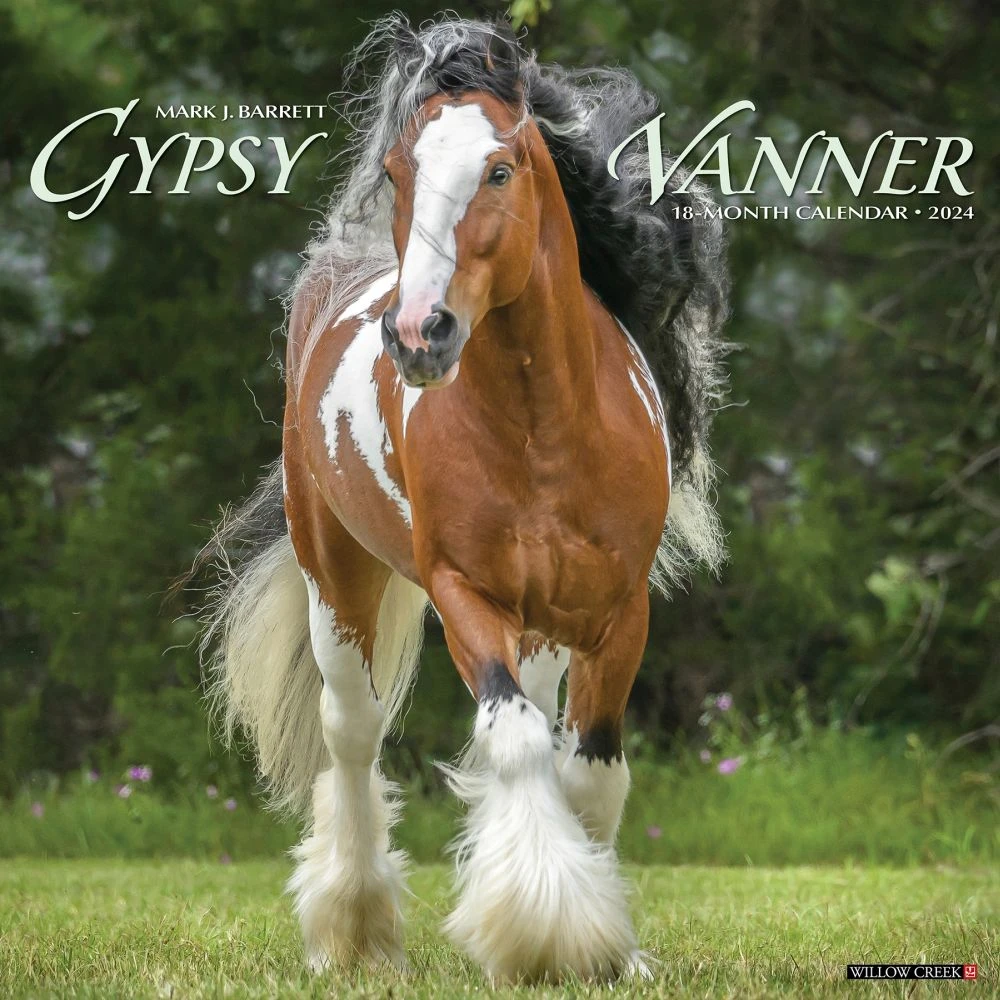 Originally bred by European Gypsies, these affectionate, magnificent horses are soaring in popularity. Twelve dazzling Mark Barrett photographs capture their power, gorgeous feathering and the beauty of their flowing manes and tails. Printed with soy based inks on FSC certified paper, this 12″ x 24″ wall calendar features large monthly grids that offer ample room for jotting notes, along with six bonus months of July through December of 2023. Also includes moon phases (CST), standard U.S. and international holidays.