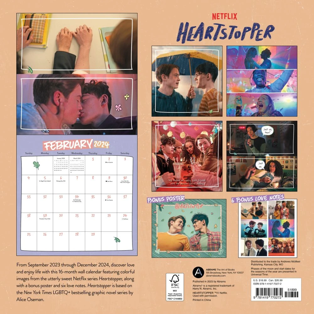 From September 2023 through December 2024, discover love and enjoy life with this 16-month wall calendar featuring colorful images from the utterly sweet Netflix series Heartstopper, along with a bonus poster and four love notes.