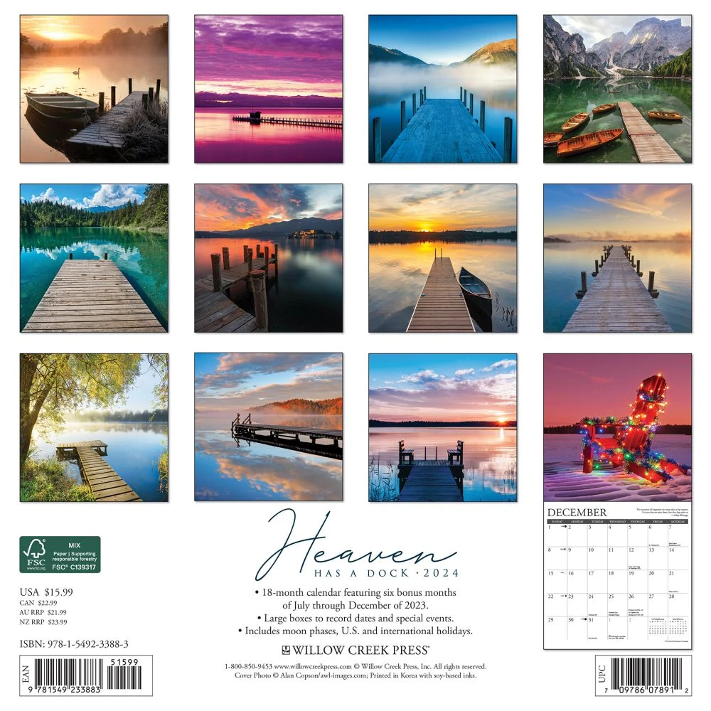 Wouldn’t it be great to enjoy spectacular water views from a dock each day of the year? These twelve dazzling photographs allow you to do just that! Inspiring sunrises, sunny afternoons, and soothing sunsets remind us that heaven indeed has a dock. Printed with soy based inks on FSC certified paper, this 12″ x 24″ wall calendar features large monthly grids that offer ample room for jotting notes, along with six bonus months of July through December of 2023. Also includes moon phases (CST), standard U.S. and international holidays.