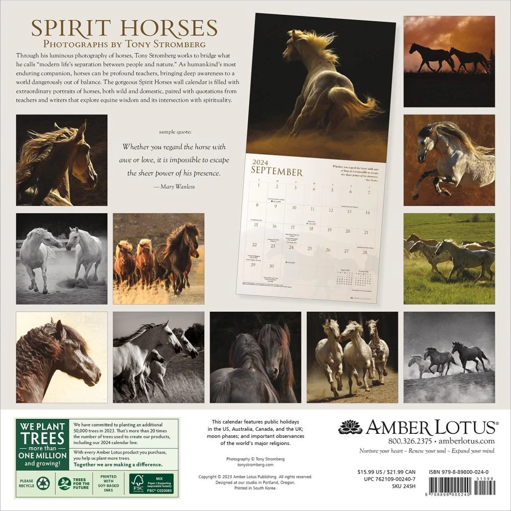 Through his luminous photography of horses, Tony Stromberg works to bridge what he calls ?modern life?s separation between people and nature.? As humankind?s most enduring companion, horses can be profound teachers, bringing deep awareness to a world dangerously out of balance. The gorgeous Spirit Horses wall calendar is filled with extraordinary portraits of horses, both wild and domestic, paired with quotations from teachers and writers that explore equine wisdom and its intersection with spirituality.
