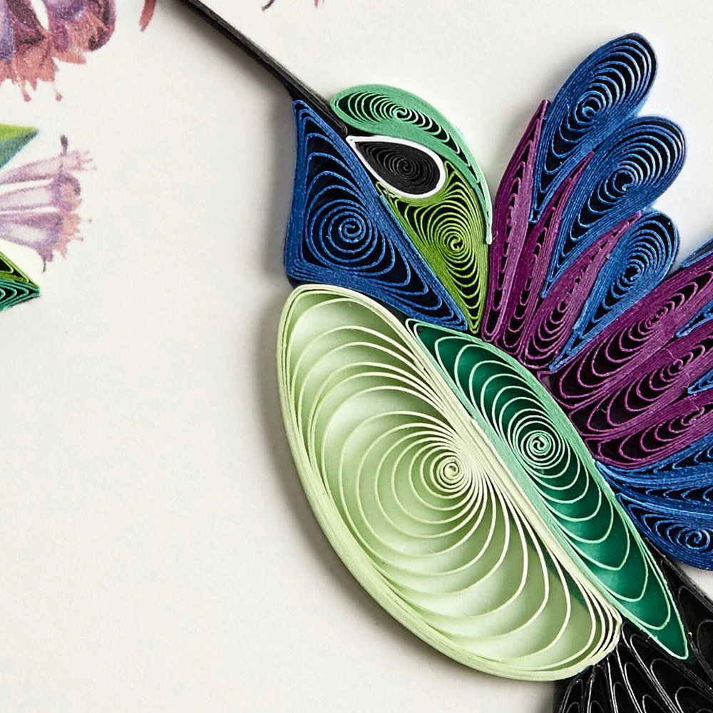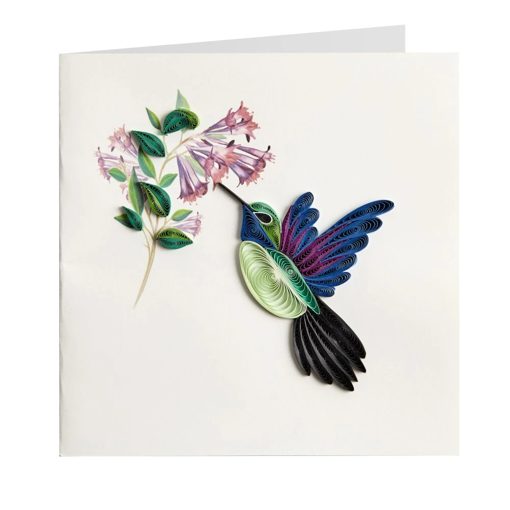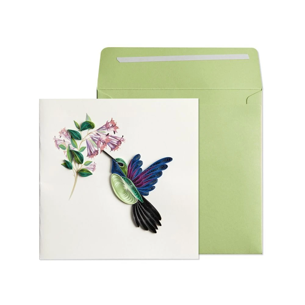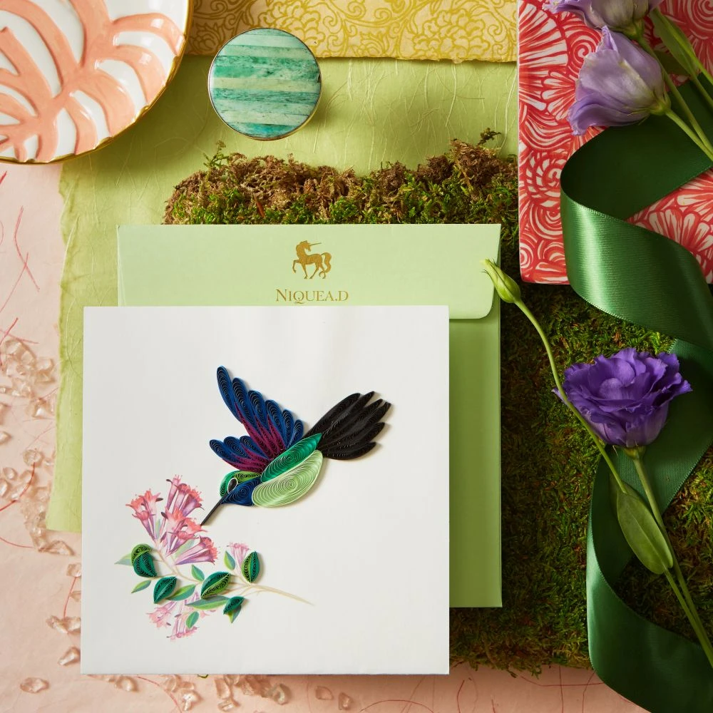 Introducing the Hummingbird Quilling Blank Card by NIQUEA.D a unique and beautiful way to show someone you care! This greeting card is exquisitely crafted by hand. The paper filigree artwork on the cover creates a lovely hummingbird that will inspire your recipient. Open up this sophisticated beauty, and inside awaits a blank canvas for you to express your heartfelt feelings in whatever creative way you would like. Express yourself with a special handmade quilling card from NIQUEA.D today!
