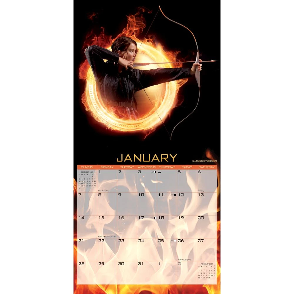 ?It?s time to join the Games! Celebrate the Hunger Games in an all new way with our limited edition 2024 Wall Calendar. As fans of Katniss know, this is a journey filled with daring determination that you can follow along with in our calendar! Each month will bring adventure and excitement as you discover iconic images from the beloved movie franchise. With enough space to jot down all of your important dates and times, it’s a must have for any fan.
