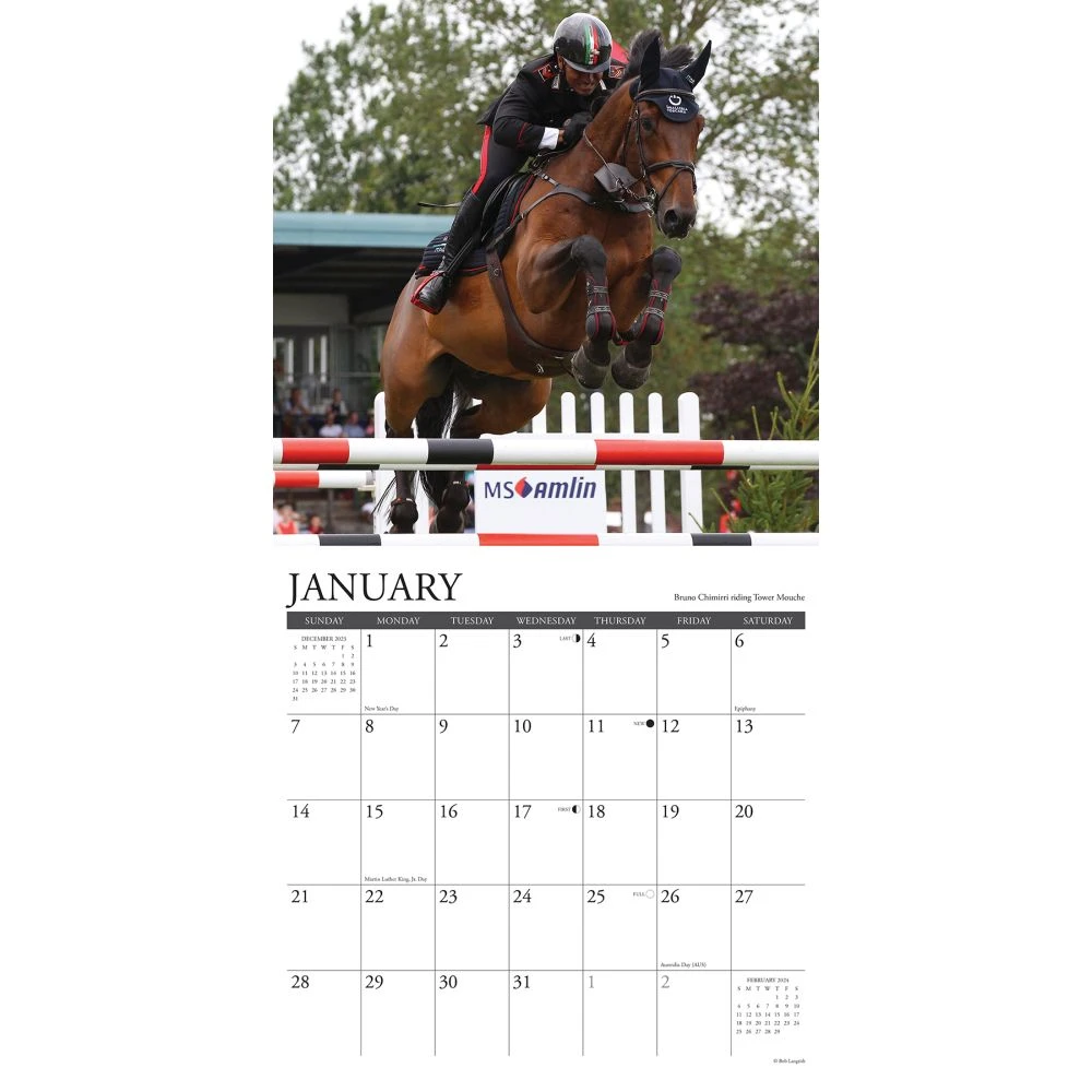 Twelve bright and exciting photographs capture all the power, energy and athleticism of hunters and jumpers. Printed with soy based inks on FSC certified paper, this 12″ x 24″ wall calendar features large monthly grids that offer ample room for jotting notes, along with six bonus months of July through December of 2023. Also includes moon phases (CST), standard U.S. and international holidays.