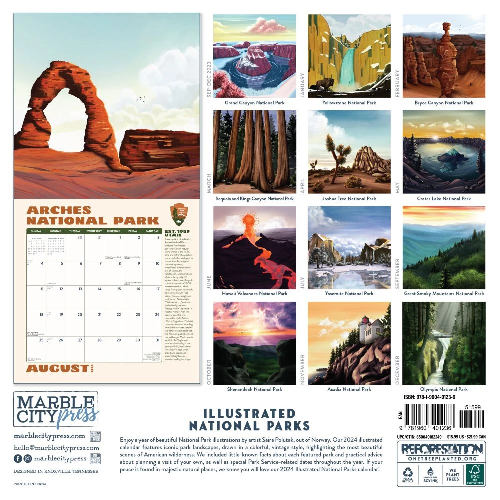 Enjoy a year of beautiful National Park illustrations by artist Saira Polutak, out of Norway. Our 2024 illustrated calendar features iconic park landscapes, drawn in a colorful, vintage style, highlighting the most beautiful scenes of American wilderness. We included little known facts about each featured park and practical advice about planning a visit of your own, as well as special Park Service related dates throughout the year. If your peace is found in majestic natural places, we know you will love our 2024 Illustrated National Parks calendar!