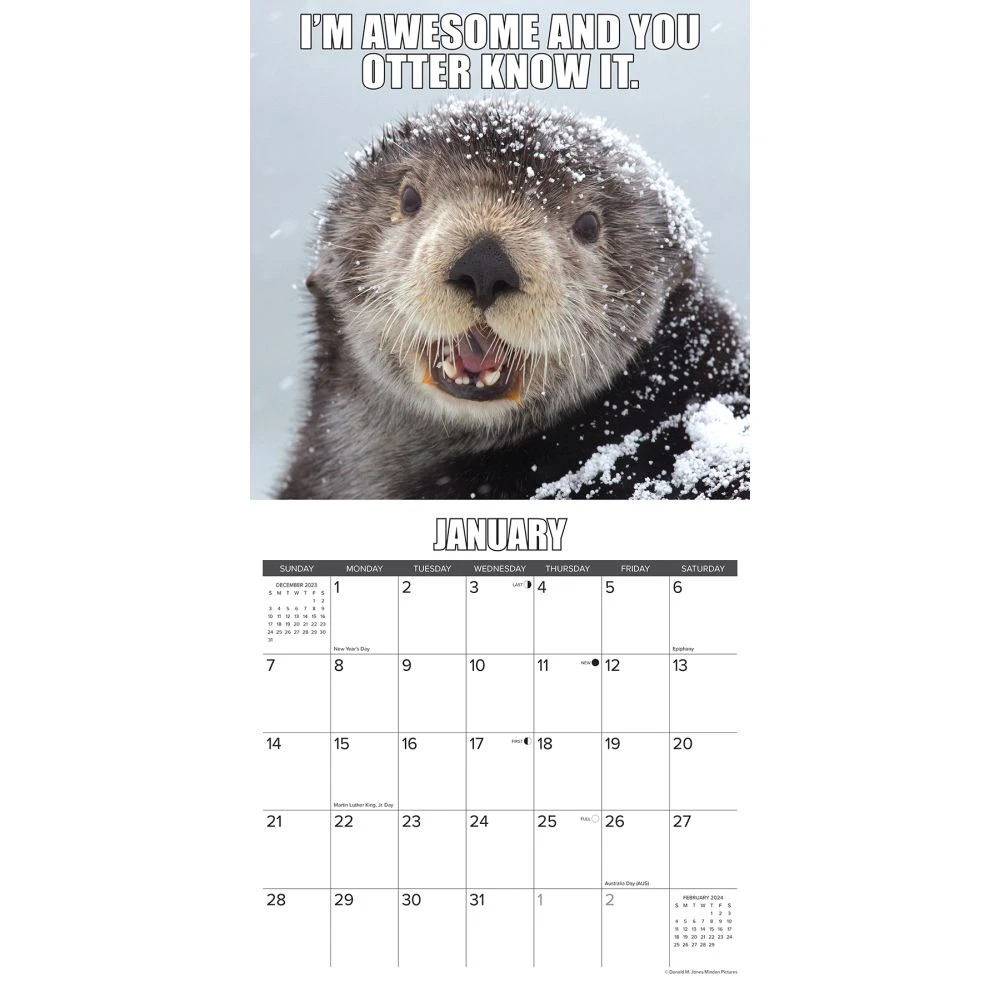 Puns + Otters = Rad. These impish ?Old Men of the Sea? are paired up with ?otterly? amazing memes to make the perfect gift for any pun fanatic. Get otter here! Printed with soy based inks on FSC certified paper, this 12″ x 24″ wall calendar features large monthly grids that offer ample room for jotting notes, along with six bonus months of July through December of 2023. Also includes moon phases (CST), standard U.S. and international holidays.