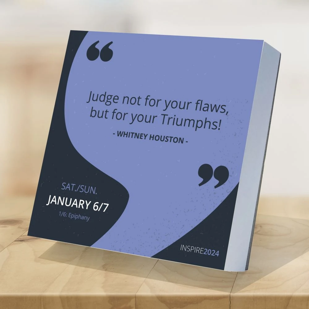 Get inspired! Featuring a dynamic color scheme with simple typography, our Inspire daily desk calendar is sure to motivate you to seize the day every day! The 2024 daily desk calendar measures 5.25″ x 5.25″ and comes with a foldout easel to sit on your desk. The daily pages (weekends combined) easily tear off with an inspirational quote on the front and the reverse side is lined for notes. Calendar comes packaged in a wraparound cover.
