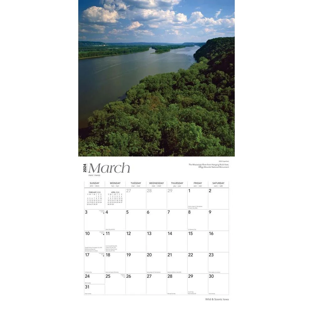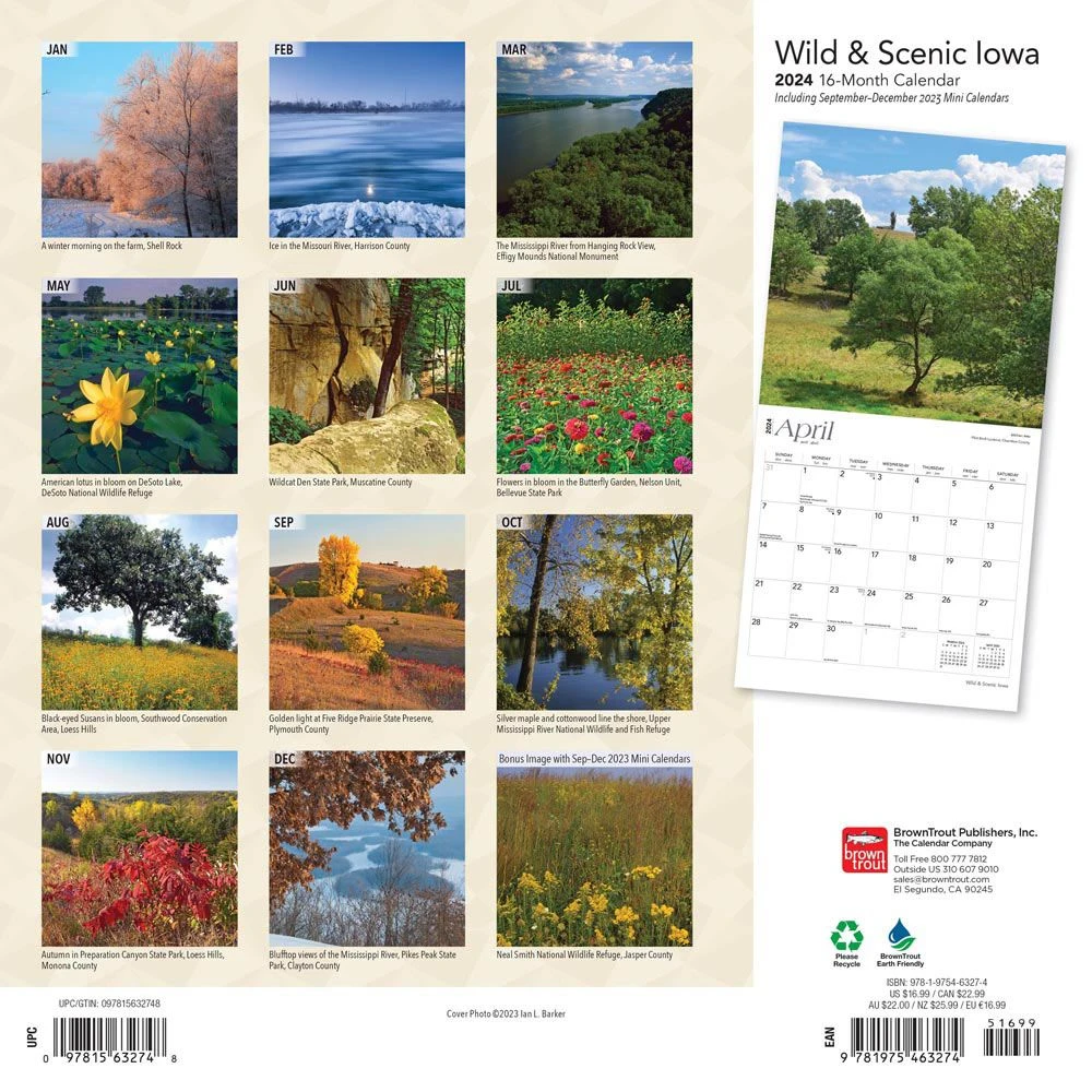 Much of Iowa lies in a cradle between the Mississippi and Missouri Rivers. The region’s rich topsoil means there is never a shortage of beautiful surprises to behold in the Hawkeye State. Calm, cool creeks meander across the prairie. Throngs of wildlife hide among silver maples in the forest. Secluded springs well up to form waterfalls. Celebrate four distinct seasons of scenic Iowa with this stunning calendar.