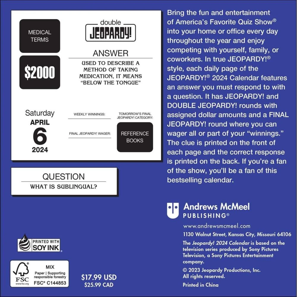 What’s more, it features the same thrilling rounds you know and love. From JEOPARDY! and DOUBLE JEOPARDY! clues with assigned dollar amounts to a nail-biting FINAL JEOPARDY! round where you can wager all or part of your “winnings”, this calendar is sure to keep you on your toes.