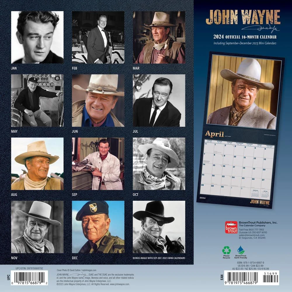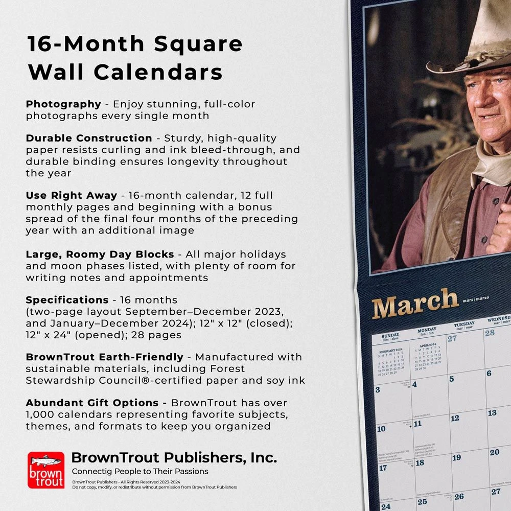 One of the world’s most beloved and admired actors, John Wayne to this day represents the epitome of rugged individualism and masculinity on the silver screen. Equally at home in Westerns as well as playing war heroes, John Wayne enjoyed many diverse character roles throughout his long and award winning film career. Celebrate the extraordinary life and career of John Wayne with this arresting wall calendar.