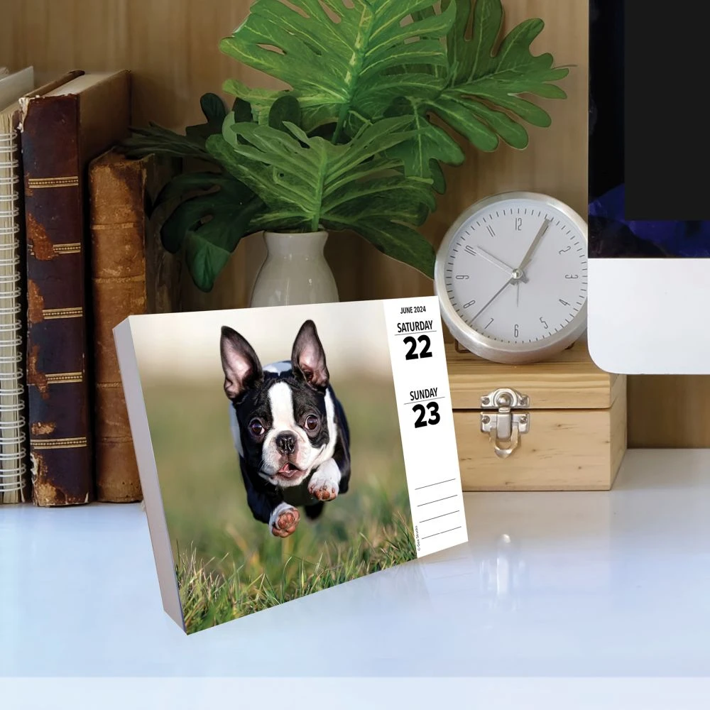 Noted for their sweet dispositions and gentle ways, Boston Terriers have soared in popularity. These 310 eye popping (pun intended) full color photographs typify all their wonderful traits and charms. Full color images on easy tear off pages are printed on high quality, FSC certified paper with soy based inks. Pages are mounted on a recyclable stand for easy display. All major public and culturally significant holidays are included.