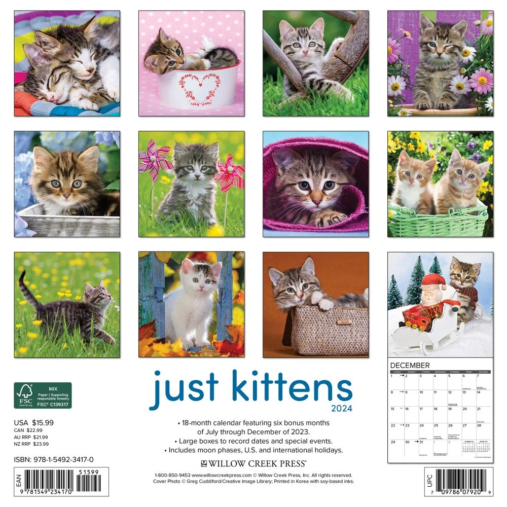 Twelve adorable, full color photographs of soft and cuddly kittens provide the purrfect way to brighten your days. Printed with soy based inks on FSC certified paper, this 12″ x 24″ wall calendar features large monthly grids that offer ample room for jotting notes, along with six bonus months of July through December of 2023. Also includes moon phases (CST), standard U.S. and international holidays.
