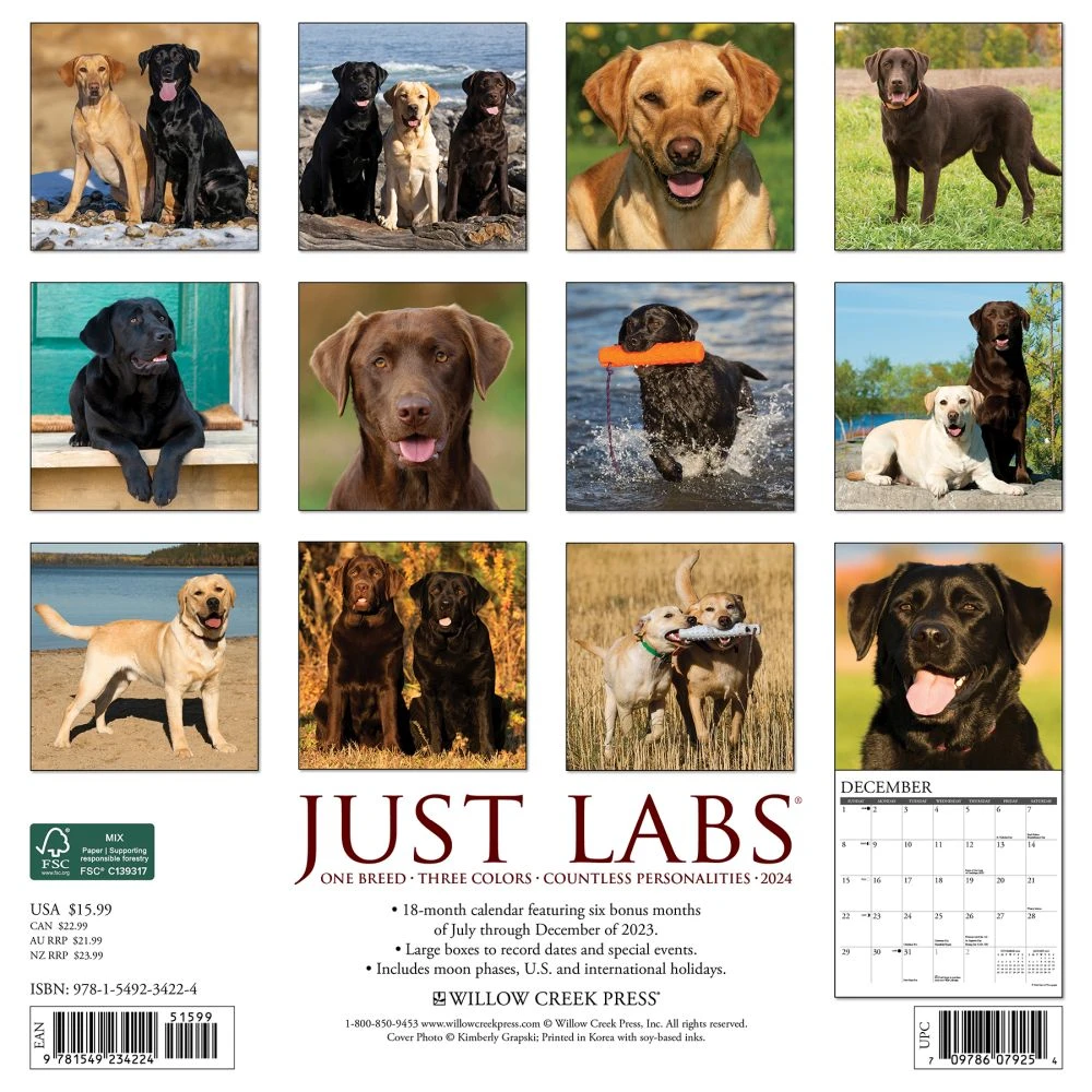 One breed, three colors, countless personalities! Twelve vivid full color photographs typify all the charm, cheerfulness and athleticism of the magnificent Labrador Retriever. Printed with soy based inks on FSC certified paper, this 12″ x 24″ wall calendar features large monthly grids that offer ample room for jotting notes, along with six bonus months of July through December of 2023. Also includes moon phases (CST), standard U.S. and international holidays.