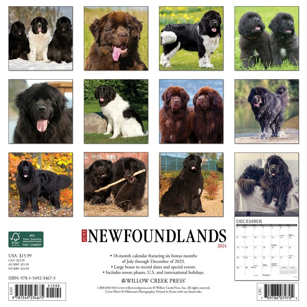 Newfoundlands are huge, imposing, bighearted creatures adored by their owners. Twelve delightful full color photographs typify their size, goodnature and easy going manner. Printed with soy based inks on FSC certified paper, this 12″ x 24″ wall calendar features large monthly grids that offer ample room for jotting notes, along with six bonus months of July through December of 2023. Also includes moon phases (CST), standard U.S. and international holidays.