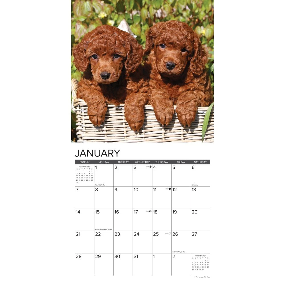 Whether they’re a standard, mini or toy, poodle puppies are full of curly cuteness. They’re nothing, if not proud and eager to please, right down to their aristocratic roots. Printed with soy based inks on FSC certified paper, this 12″ x 24″ wall calendar features large monthly grids that offer ample room for jotting notes, along with six bonus months of July through December of 2023. Also includes moon phases (CST), standard U.S. and international holidays.