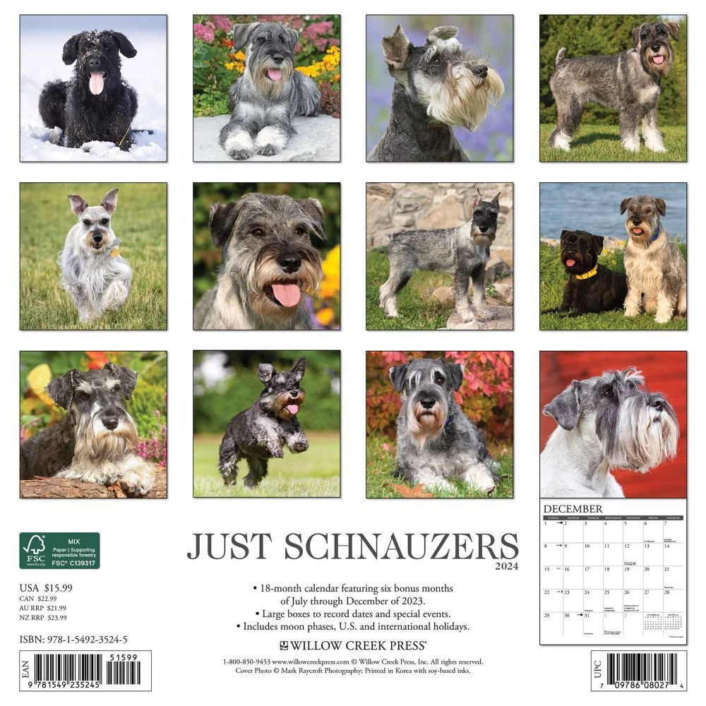Their name is aptly derived from the German ?Schnauze?, meaning ?snout?, and aptly so! Printed with soy based inks on FSC certified paper, this 12″ x 12″ wall calendar features large monthly grids that offer ample room for jotting notes, along with six bonus months of July through December of 2023. Also includes moon phases (CST), standard U.S. and international holidays.
