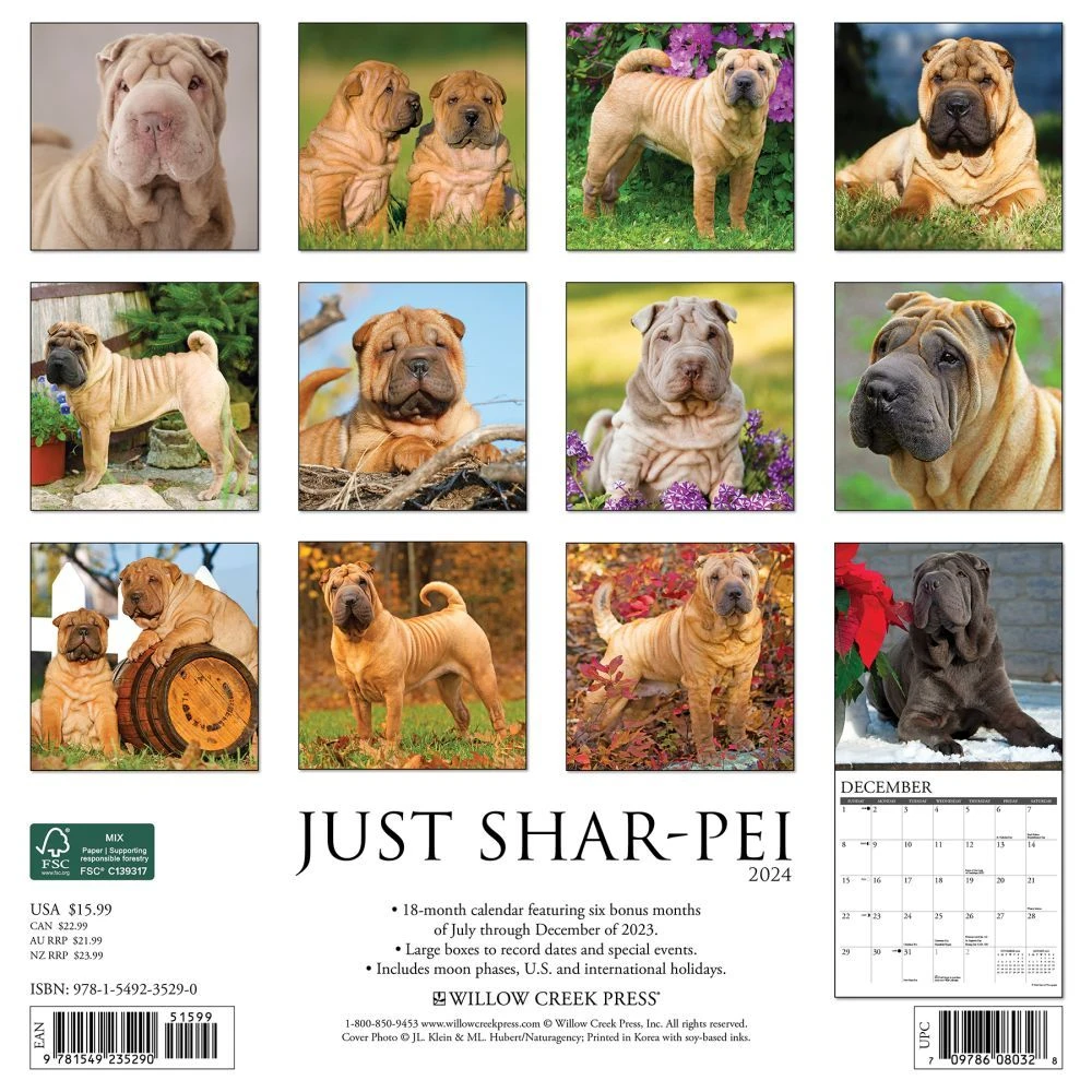 Hidden under the hippopotamus snout, black tongue, and wrinkles for days is an ancient Chinese guard dog who was once the rarest dog breed in the world. These regal, independent guardians are discerning with the company they keep and the people they choose to love. Printed with soy based inks on FSC certified paper, this 12″ x 12″ wall calendar features large monthly grids that offer ample room for jotting notes, along with six bonus months of July through December of 2023. Also includes moon phases (CST), standard U.S. and international holidays.