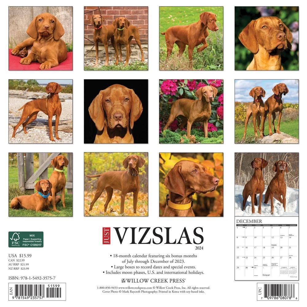 Although Vizslas are excellent, hard charging sporting dogs, they are gentle, good natured and loving in a home setting. All of the fine characteristics of these distinctive, smooth coated dogs are embodied in twelve bright, full color photographs. Printed with soy based inks on FSC certified paper, this 12″ x 24″ wall calendar features large monthly grids that offer ample room for jotting notes, along with six bonus months of July through December of 2023. Also includes moon phases (CST), standard U.S. and international holidays.