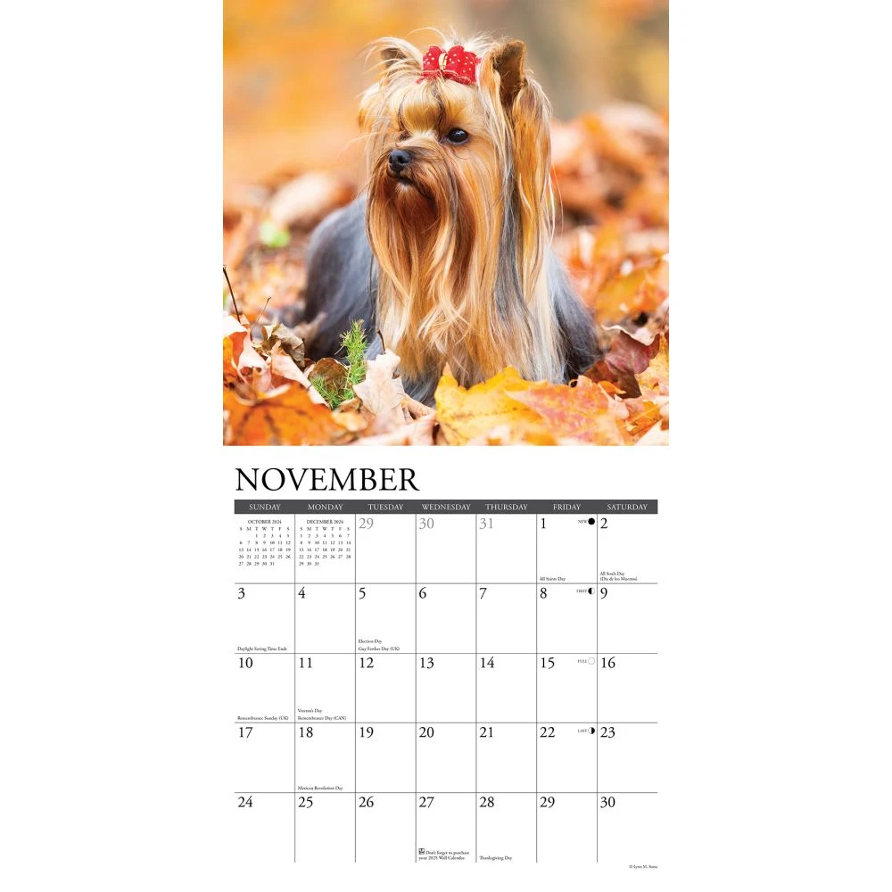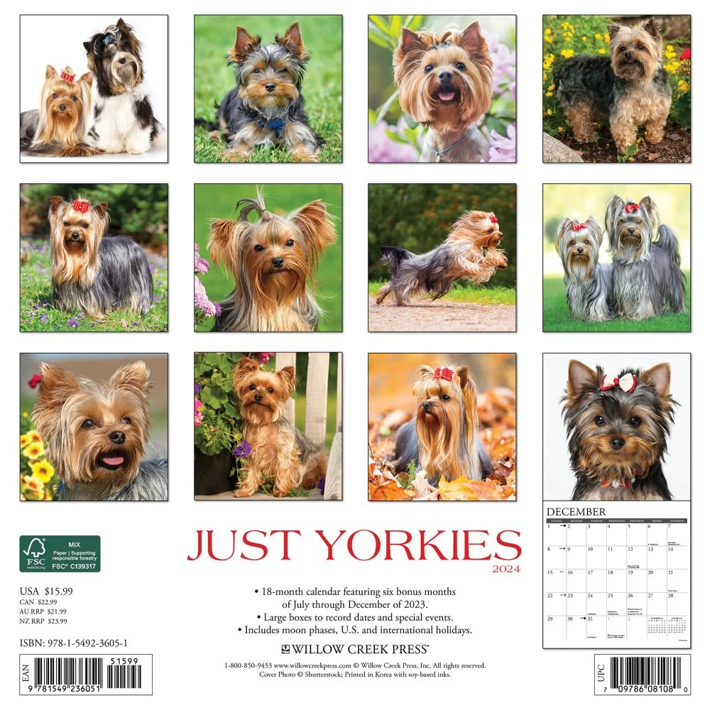 The tiny Yorkshire Terrier, typified by its silky blue and tan coat, is a perky, clever and loyal companion. All the charms of this popular breed are captured in twelve delightful, full color photographs. Printed with soy based inks on FSC certified paper, this 12″ x 12″ wall calendar features large monthly grids that offer ample room for jotting notes, along with six bonus months of July through December of 2023. Also includes moon phases (CST), standard U.S. and international holidays.