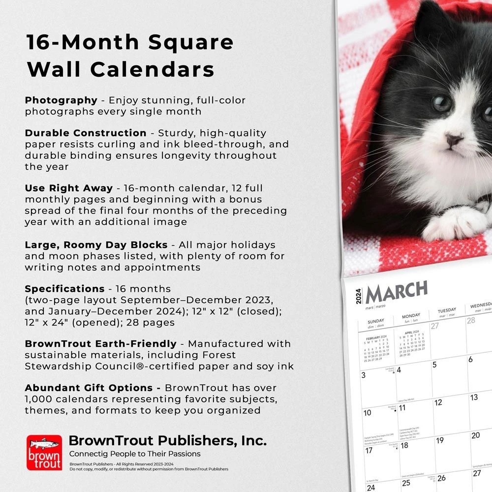 If you are a kitten lover, you know that you are. You probably own one, and care about him or her very much. You also probably love pictures of cute kittens in cute poses. Well, look no further, because this calendar is perfect for you! Replete with photographs of various breeds with different backdrops, this calendar is sure to fulfill all of your kitten loving needs.