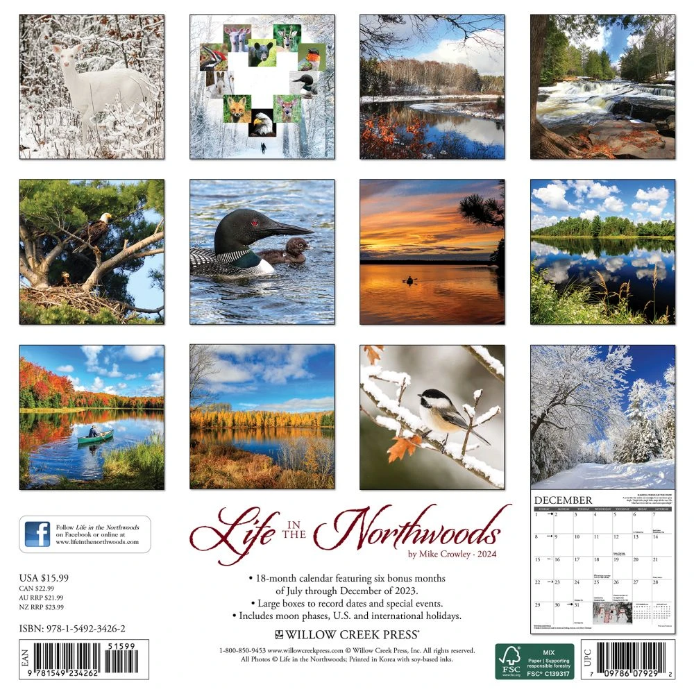 Photographer Michael Crowley lives in the Northwoods surrounded by sparkling lakes, rushing rivers, spectacular scenic views, and a host of wildlife. You can almost smell pine scent as Michael shares these 12 full color magnificent Northwoods photos. Printed with soy based inks on FSC certified paper, this 12″ x 24″ wall calendar features large monthly grids that offer ample room for jotting notes, along with six bonus months of July through December of 2023. Also includes moon phases (CST), standard U.S. and international holidays.