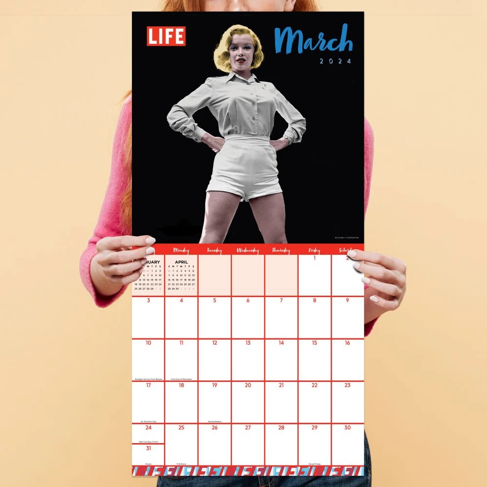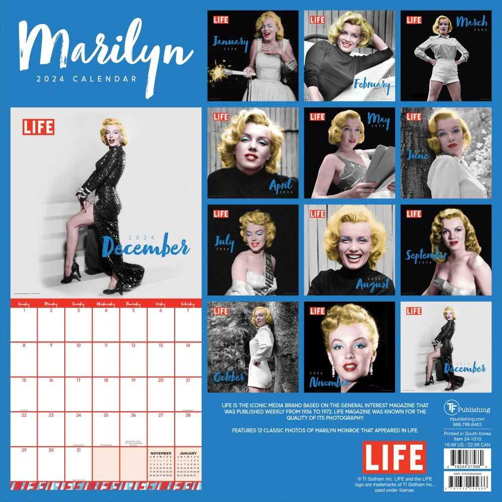 LIFE is the iconic media brand based on the general interest magazine published through 2000 known for the quality of its photography. This calendar features 12 classic photos of Marilyn Monroe. This 2024, 12 month wall calendar measures 12″ x 12″ and includes beautiful black and white photos combined with the monthly calendar grids and a bonus 4 month view of January 2025 April 2025. Printed on premium matte paper that works great with either a pen or pencil.